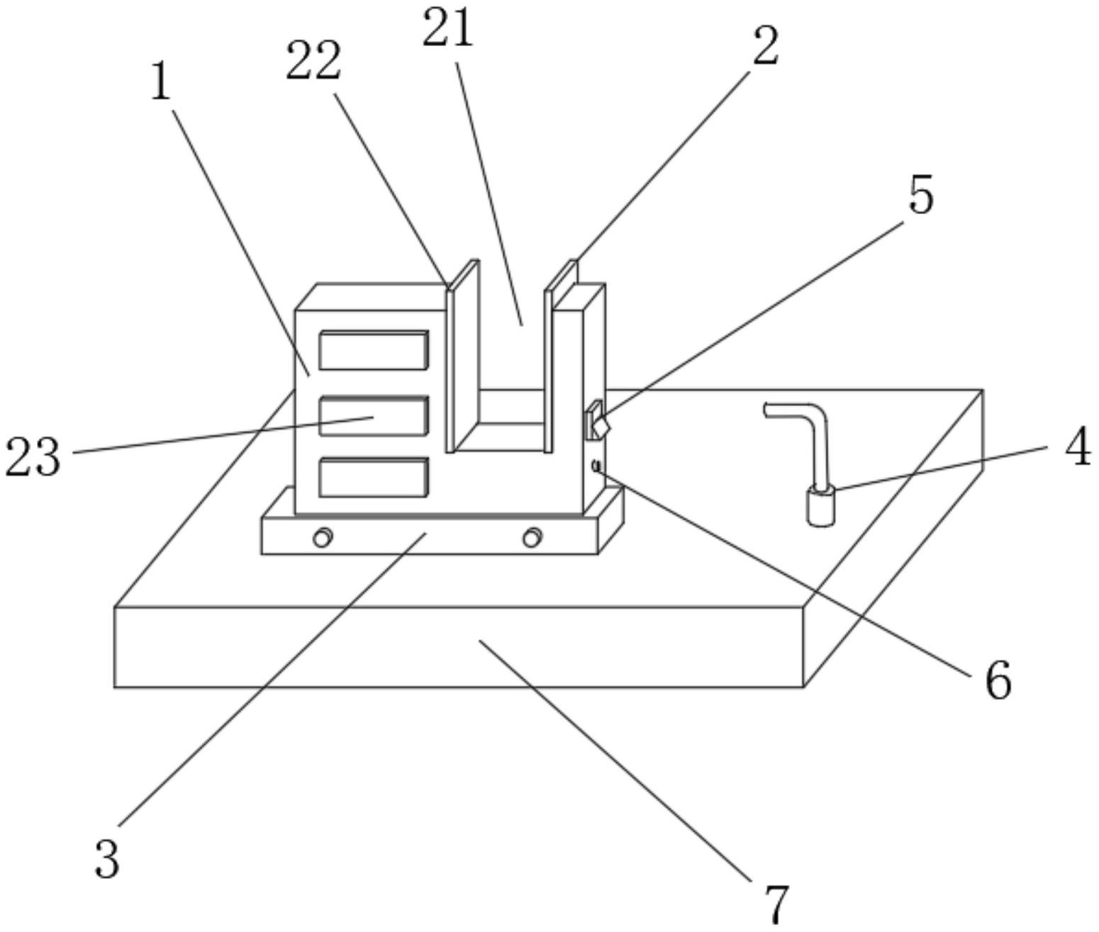本实用新型涉及光穿透率透过仪领域,具体为一种快速连续测量材料光穿透率的透过率仪,包括透过率测量仪,透过率测量仪的中部设置有可以测量结构,测量结构的下方设置有可以固定透过率测量仪的固定结构,固定结构的下方设置有底板,固定结构的一侧设置有能够清理灰尘的清理结构,本实用新型通过螺纹插销的紧固和松弛来固定透过率测量仪,透过率测量仪会插入凹槽中,然后在使用螺纹插销进行固定,有了螺纹帽和螺纹插销,透过率测量仪在检测时就不会随意晃动,使用时更加的方便,通过电机的转动可以带动风扇进行旋转,从而产生强劲的风力,可以对透过率测量仪进行清理,清除其表面的灰尘,吹出的风还可以对机器进行散热,使其高效持续地使用。