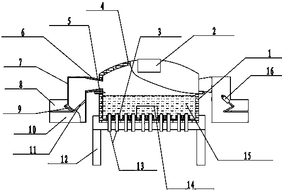 一种具有电助熔功能的浮法玻璃熔窑,包括窑体、加热小炉、烟道和电极;加热小炉对称均匀设置在窑体的左右两侧,烟道设置在加热小炉的外侧,电极设置在窑体的底部;所述的窑体下部为支撑架,支撑架上前部熔池,后部设置有连接流道;所述的熔池下部为熔化玻璃的箱体,熔池底部设置有电极;本实用新型提出的技术方案,达到了良好的效果:具有电助熔功能的浮法玻璃熔窑通过在玻璃熔化窑的底部设置电极对熔化窑内玻璃配合料下部进行辅助加热,缩短了玻璃配合料的熔化时间,改善玻璃熔液的对流状态,提高玻璃配合料熔化指数,有利于玻璃熔液中气泡的排出和均匀性的提高,从而提高玻璃产质量,同时降低了有害烟尘的排放,给企业创造了效益。
