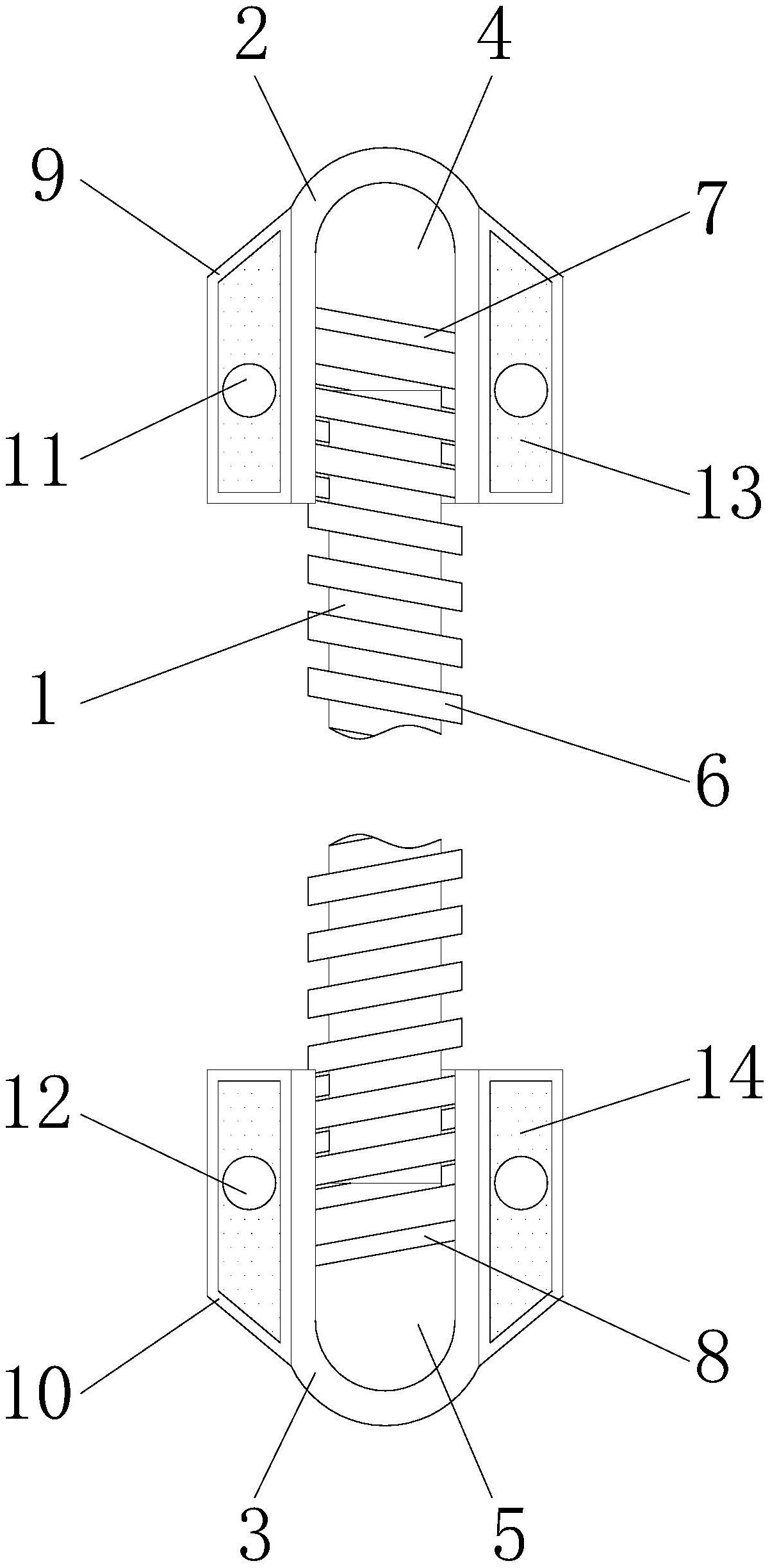 本实用新型公开了一种调光门供电线保护装置,包括软管,所述软管的顶部和底部分别设置有第一固定块和第二固定块,所述第一固定块的正表面开设有与软管配合使用的第一凹槽,所述第二固定块的正表面开设有与软管配合使用的第二凹槽,所述软管的顶部和底部分别延伸至第一凹槽和第二凹槽的内腔,所述软管的表面设置有安装齿牙。本实用新型通过设置软管、第一固定块、第二固定块、第一凹槽、第二凹槽、安装齿牙、第一固定齿牙、第二固定齿牙、第一安装板、第二安装板、第一安装孔和第二安装孔,解决了现有调光门供电线容易被扯断夹断的问题,该调光门供电线保护装置,具备可保护供电线不被扯断夹断的优点,值得推广。