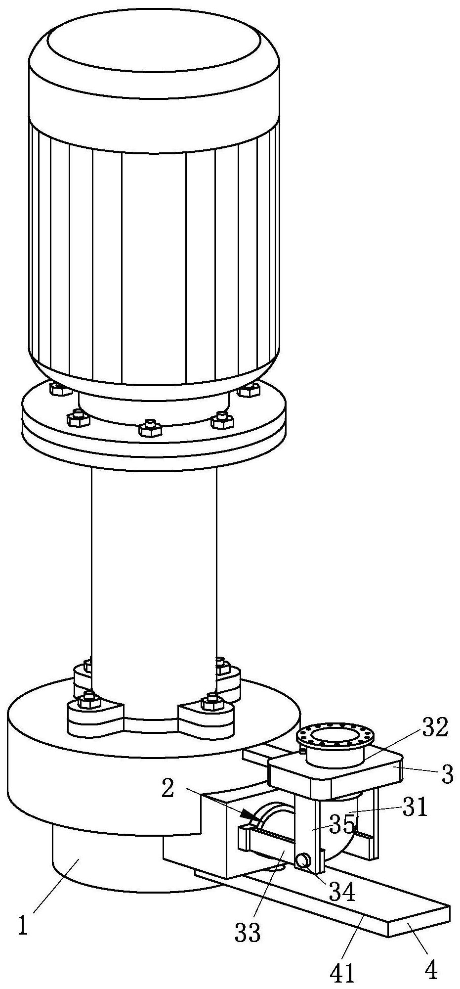 本发明涉及离心泵技术领域,具体说是一种立式液下离心泵,包括离心泵本体、出水口、调节结构、导水软管、连接法兰、第一支撑杆、第一转轴、第二支撑杆和支撑结构。本发明的有益效果是:通过将连接法兰与离心泵本体之间安装导水软管,使得用于连接排水管的连接法兰可以进行任意角度的调节,当离心泵的安装位置液面较低时,连接法兰可以改变角度从而降低排水管的连接高度,方便操作人员进行安装,同时连接法兰与离心泵本体之间设有转动连接的第一支撑杆和第二支撑杆,可以限制连接法兰的移动范围,从而保证连接法兰仅可进行同一平面上的转动,方便调节连接法兰角度的同时降低转动对于导水软管的损伤,避免导水软管弯折。