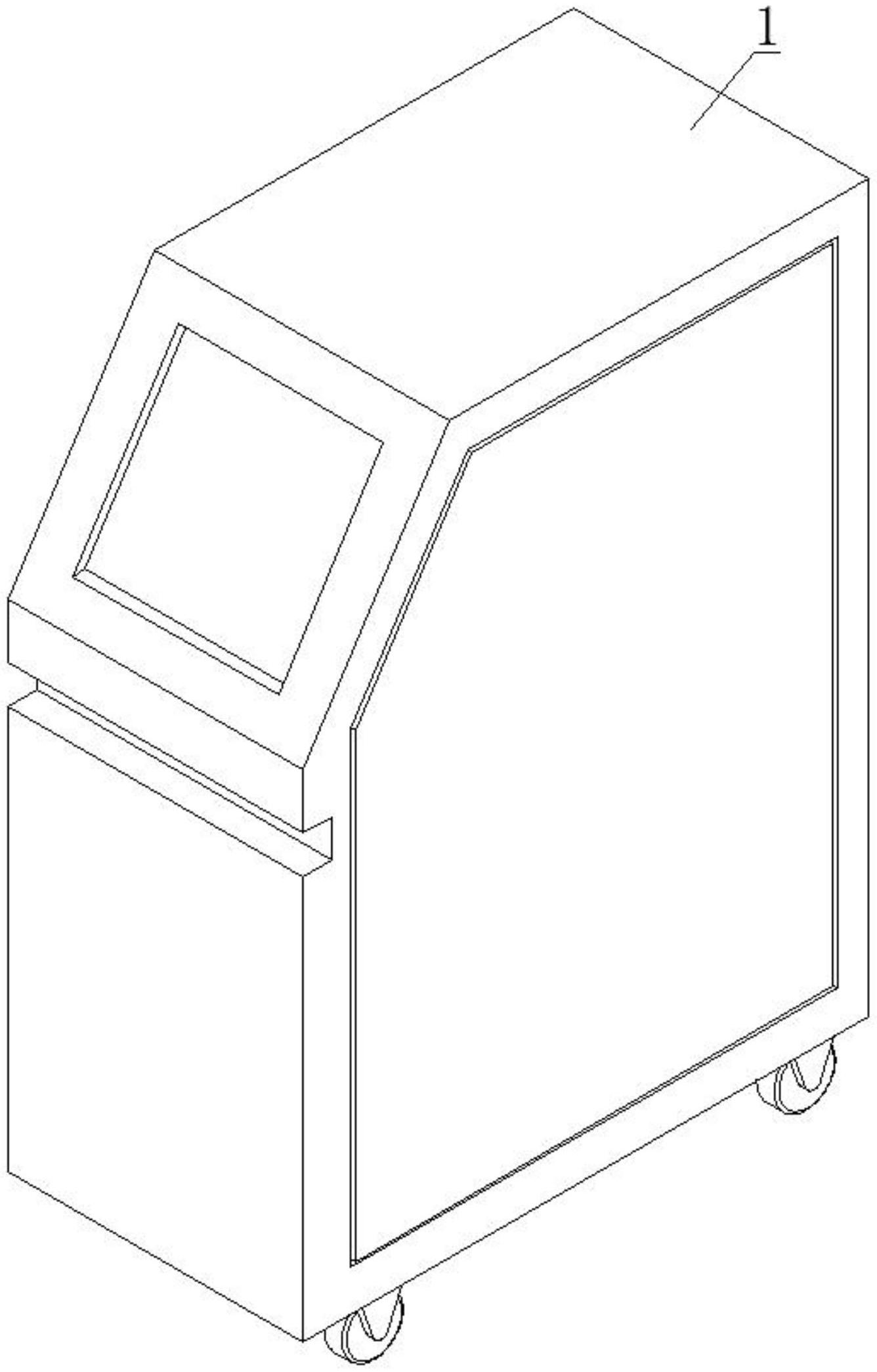 本实用新型涉及模温机技术领域,公开了设有可自动伸缩底座结构的模温机,包括模温机,模温机底面开设有吹尘孔,模温机内腔开设有升降槽,升降槽内腔底面设置有吹尘罩,升降槽内腔底面轴接有螺纹杆,螺纹杆外表面下端设置有第一齿轮,吹尘罩内腔顶壁轴接有第一旋转杆,第一旋转杆下端设置有第二齿轮,第二齿轮底面设置有扇叶,冠齿轮旋转后带动螺纹杆进行旋转,螺纹杆旋转后从而使升降板向上移动,在螺纹杆旋转的同时带动第一齿轮进行旋转,第一齿轮旋转后从而使第二齿轮进行旋转,第二齿轮旋转后从而使扇叶旋转,从而产生气流,气流吹向地面,进而起到除尘的效果。