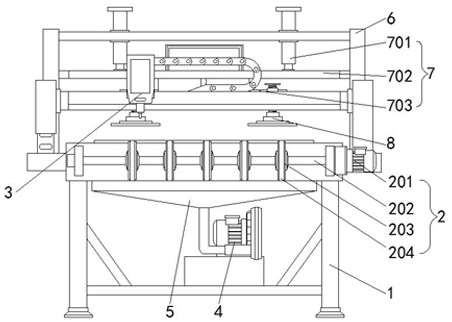 本实用新型涉及玻璃加工技术领域,且公开了一种玻璃加工用裁切装置,包括操作台,所述操作台的正面固定安装有一端延伸至操作台内部的传输机构,所述操作台的底部固定安装有气浮风机,所述气浮风机的输入端连通有一端延伸至操作台内部的收集仓,所述操作台的顶部固定安装有切割机本体,所述操作台的顶部固定安装有位于切割机本体背面的支撑架。该玻璃加工用裁切装置,解决了现有的玻璃加工用裁切装置在使用时,不具备稳固玻璃的功能,使玻璃在裁切过程中容易发生位移,影响裁切效果,且在裁切完成后,需要人工将玻璃进行分离,较为费时费力,使用较为不便的问题。