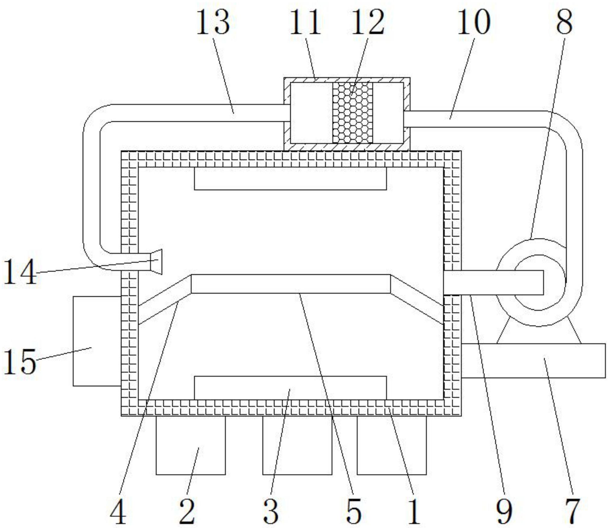 本实用新型公开了一种环保型电阻式玻璃退火炉,包括炉体,炉体的底部固定安装有支撑柱,且炉体的内底壁和内顶壁均固定安装有加热块,炉体的左右两侧内壁均固定安装有支撑架,且两个支撑架之间固定安装有放置板,且放置板上设有通孔,炉体的右侧面固定安装有机板,机板的顶部固定安装有抽风机,且抽风机的左右两侧分别连通有进风管和出风管,进风管远离抽风机的一端贯穿延伸至炉体的内部,炉体的顶部固定安装有处理箱,处理箱的内部设有过滤棉,出风管远离抽风机的一端贯穿延伸至处理箱的内部,处理箱的左端连通有导风管。该实用新型对退火过程气体中含有的杂质进行吸收后重新吹入炉体中,利用气体中的余热,环保效果好。