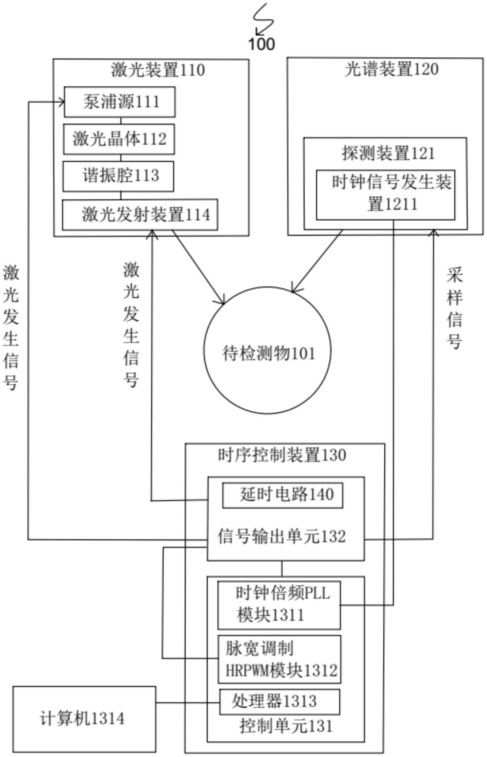 本实用新型公开了一种LIBS系统,包括:激光装置,能够向待检测物发射激光;至少一台光谱装置,能够检测并分析经等离子体刻蚀的所述待检测物发出的光谱;以及时序控制装置,所述时序控制装置能够基于同一时钟源向所述激光装置和所述光谱装置发送控制信号,当光谱装置为一台时,时序控制装置基于同一时钟源向激光装置和光谱装置发送控制信号,能够消除因激光装置和光谱装置基于不同基准时钟运行而产生的信号延迟,提高了光谱采集的准确性,当光谱装置为多台时,不仅克服了光谱装置对外部触发信号(激光发射信号)的响应的触发延迟抖动,而且实现了多个光谱装置或同一光谱装置的多个通道的同步运行,进而实现了同时对多个待测样品的检测。