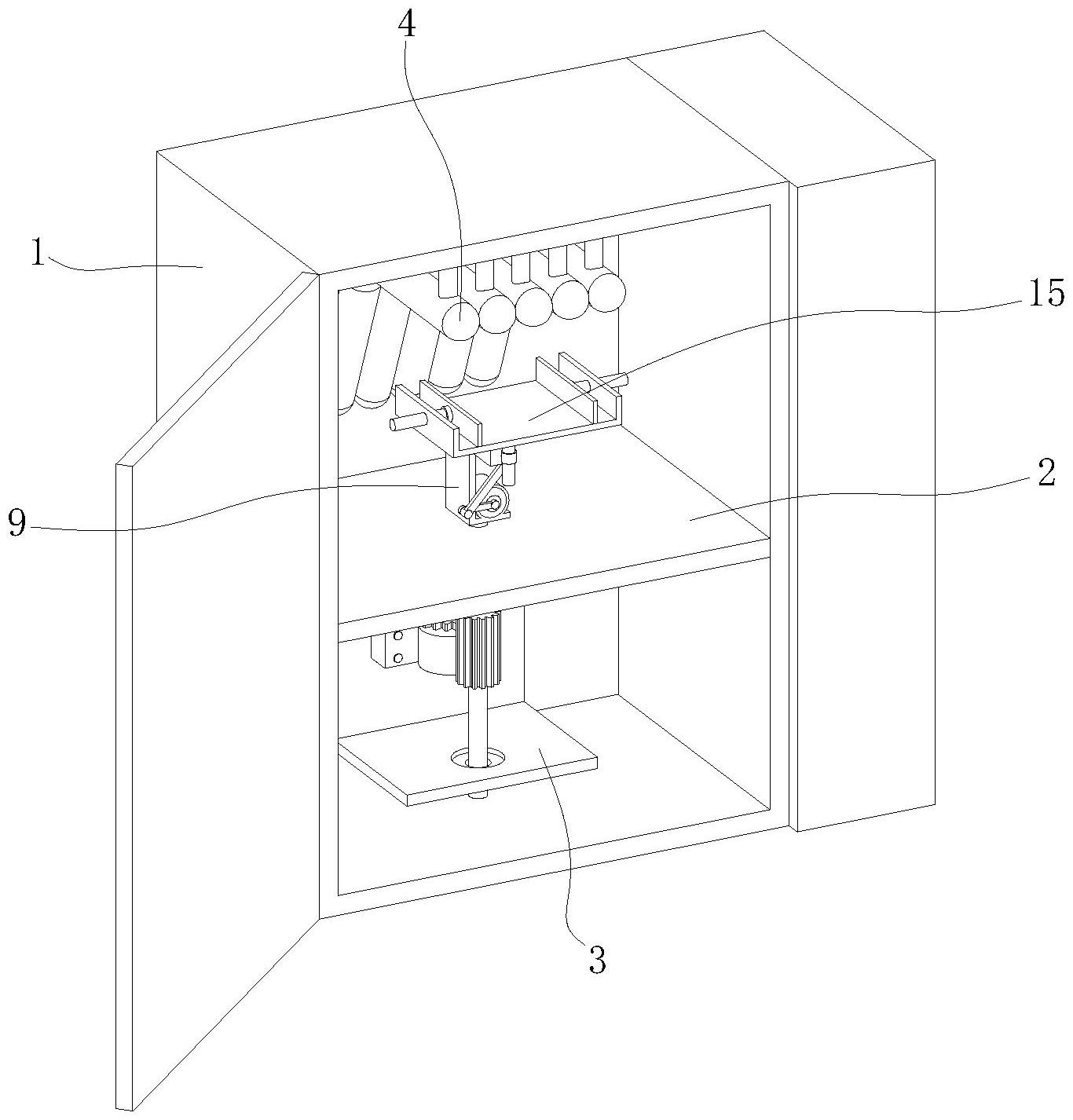 本实用新型涉及试验箱技术领域,且公开了氙灯老化试验箱,所述安装架的内部前部插接有连接轴,所述连接轴的顶端固定安装有装夹支架,所述装夹支架的内部固定安装有第二电机,所述第二电机的转子同轴固定连接有主传动杆,所述装夹支架的顶部插接有转动轴,所述转动轴的前部固定插接有顶杆,且顶杆的顶端固定安装有检测托盘。该氙灯老化试验箱,通过第二电机带动主传动杆和拉杆的运动,从而可通过副传动杆带动转动轴的转动,进而可通过顶杆带动检测托盘进行左右的往复倾斜,使得检测托盘内部的物体在进行照射时,可使得物体的左右侧面均受到均与有效的照射,提升了检测数据的精准度。