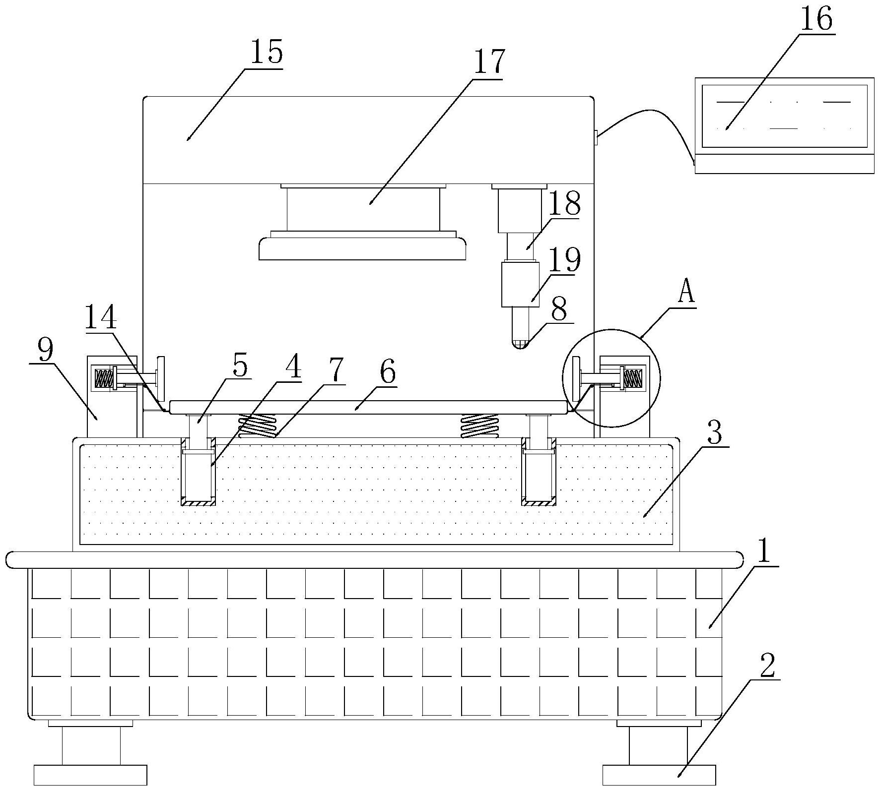 本实用新型公开了一种设有触点测头结构的自动式二次元检测仪器,包括支撑架、支撑腿、底座、第一滑槽、滑动杆和置物架,所述支撑架下端固定安装有支撑腿,且支撑架上端固定安装有底座,所述底座内侧开设有第一滑槽,且第一滑槽内侧嵌套有滑动杆,并且滑动杆上端固定安装有置物架。该设有触点测头结构的自动式二次元检测仪器通过工件自身的重量,下压置物架,从而使下端的第一伸缩弹簧受到挤压,置物架向下移动,通过牵引绳的连接,带动两端的夹板向工件两端移动,对置物架上的工件进行限位挤压,使其固定,从而达到了自动限位的效果,防止在对工件进行测量的时候,工件因触碰而出现移动,造成测量的数据出现误差。