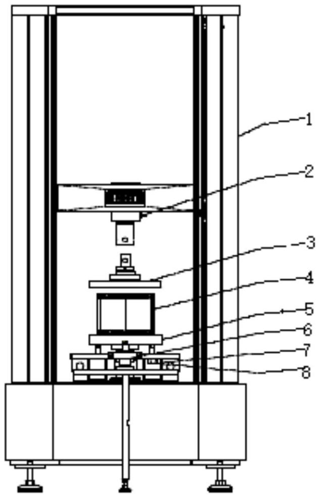 本实用新型公开了一系簧刚度检测机,包括电子万能试验机,所述电子万能试验机的中部设有测力传感器,所述测力传感器的下方设有上压盘,所述上压盘的下方设有下压盘,所述上压盘和下压盘之间设有弹簧,将弹簧放置在上压盘和下压盘之间,然后利用丝杠运动将测力传感器向下运动,从而对弹簧进行测试,从而达到对弹簧测试的作用,所述下压盘的底部设有夹具,所述夹具的下方设有限位座。本实用新型通过在电子万能试验机的内部设置传感器、上压盘和下压盘,当需要进行试验的时候,将弹簧放置在上压盘和下压盘之间,然后利用丝杠运动将测力传感器向下运动,从而对弹簧进行测试,从而达到对弹簧测试的作用,方便使用。