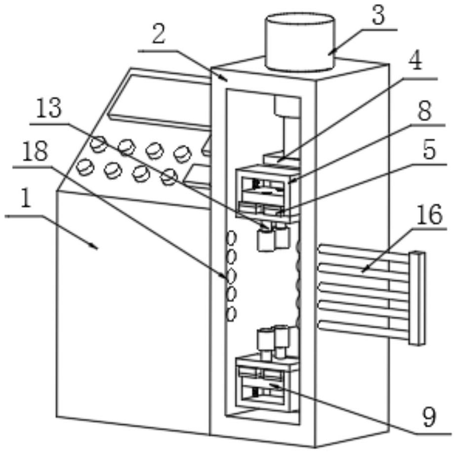 本实用新型提供电子万能试验机检测钢绞线用拉伸夹具,涉及钢绞线检测领域。该电子万能试验机检测钢绞线用拉伸夹具,包括机体、检测框和液压缸,所述检测框内腔底部和顶部均设置有传动块,所述传动块一侧设置有固定框,所述固定框内部两侧均设置有固定板,所述固定板与固定框之间设置有螺杆。该电子万能试验机检测钢绞线用拉伸夹具,通过插板和夹紧板的配合,将钢绞线两端彻底固定在固定框内部,并且固定框受到的力越大钢绞线固定的越紧,减少因为钢绞线与固定框脱离固定造成的机体对钢绞线拉伸检测失败,并且可以通过固定板和螺杆配合,在检测框外侧将钢绞线两端固定到两个固定框内部,避免工作人员在检测框内部操作钢绞线。