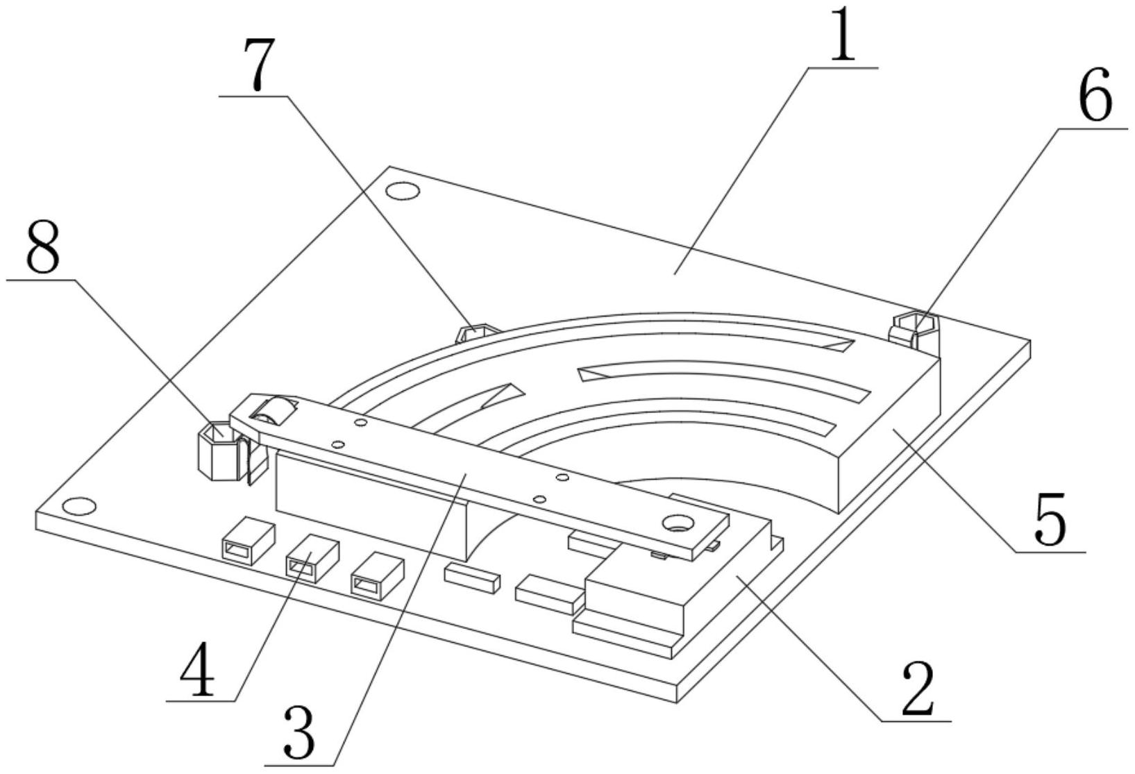 本实用新型提供一种适用于大电流电压测试的开关装置,包括PCB板,其特征在于,所述PCB板上表面的一侧设有驱动电机,所述驱动电机的上表面与旋板的一端相连接,所述PCB板的上表面且位于所述驱动电机的一侧设有连线端口,所述PCB板的上表面且位于所述驱动电机的另一侧环绕有辅助板。本实用新型设有三个档位,能够根据不同电流、电压的情况自由适配调节,可以保证装置的持续稳定运行,防止电流电压过大而造成装置损坏的情况发生,同时辅助板内部设有相应档位的辅助槽,且不同辅助槽的内部分别在不同位置开设有倒角,便于旋板内部滚珠在辅助槽内部的移动,能够使滚珠的上端接触到压力传感器,使对应位置的压力传感器传出信号,保证测试的顺利进行。