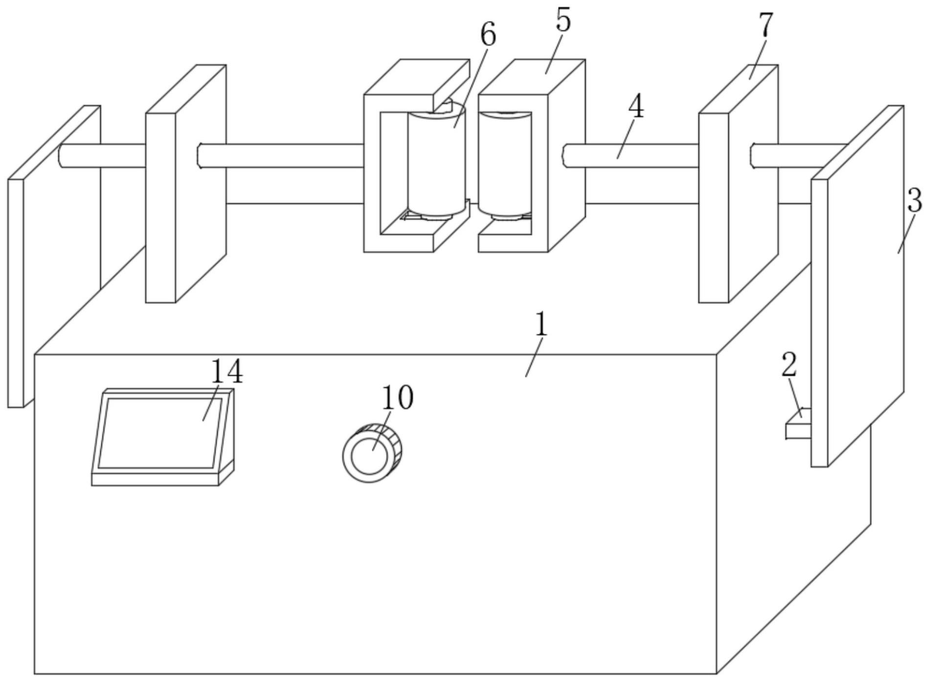本实用新型公开了一种旋钮式轴承滚轮稳线调节装置,属于电力设备技术领域,包括机体,机体的相反两侧侧壁均贯穿且滑动连接有移板,且两个移板呈高低设置,移板靠外的一端固定连接有支撑板,支撑板靠近移板一侧的上方位置固定连接有移杆,两个移杆相对一端均固定连接有滚轮架,两个滚轮架相对一侧的内槽转动设有轴承滚轮,机体顶部固定连接有限位板,移杆与限位板贯穿且滑动连接,机体靠近两个移板之间的内槽中间位置转动连接有齿轮,两个移板相对一侧均固定连接有啮齿,移板通过啮齿与齿轮啮合连接;本实用新型两个稳线轴承滚轮,通过调节二者之间的间距,进而方便稳线装置适配不同规格直接的电线电缆走线稳线加工使用。