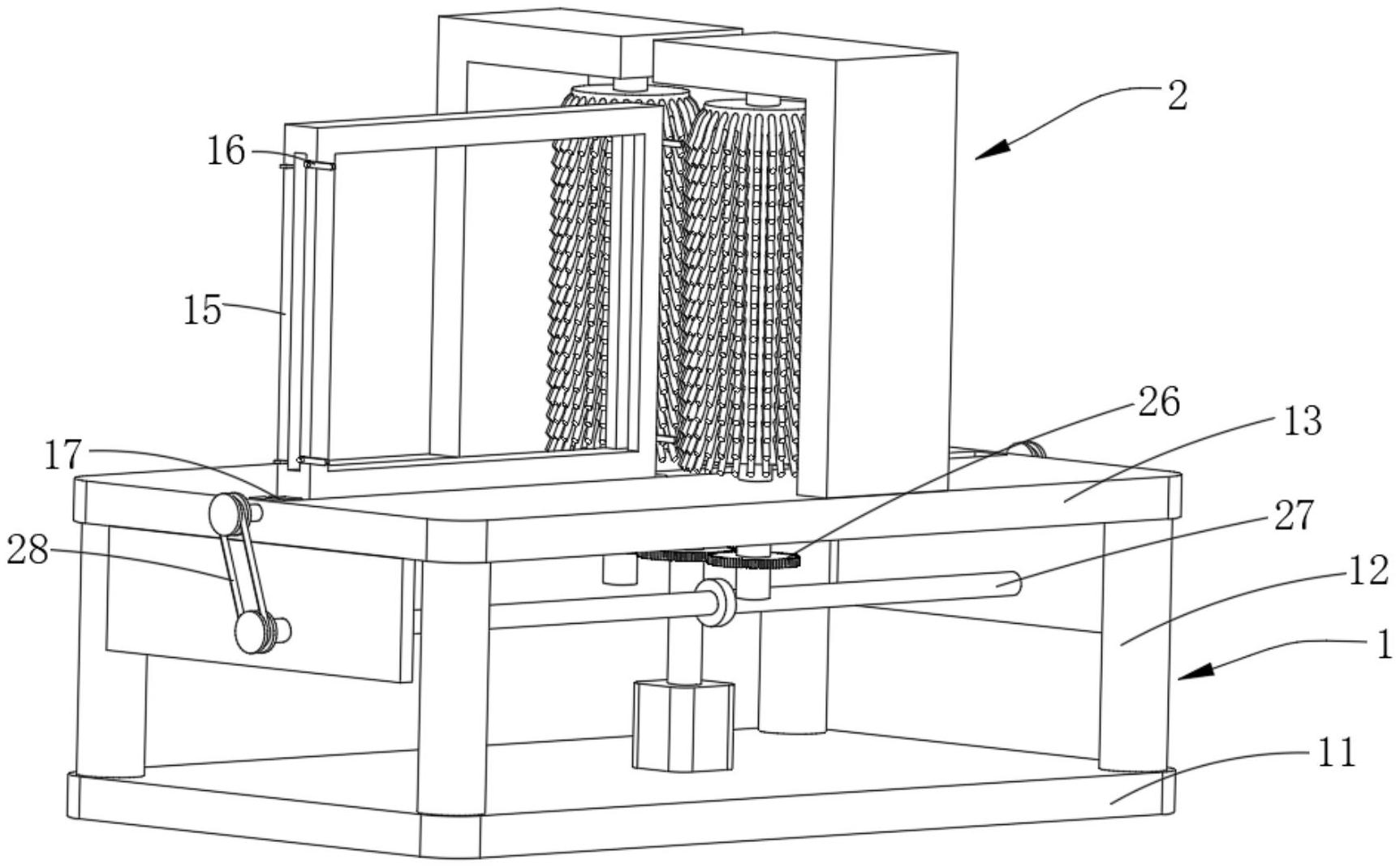 本实用新型公开了一种PC板高效清洁装置,具体包括:主体单元,包括底板、设置于所述操作台上的清洗框、设置于所述清洗框上用于卡合板材的多个限位组件、以及设置于所述操作台与清洗框之间的移动组件;清洁单元,包括固定设置于所述操作台上的多个安装架、固定设置于所述转动辊上的擦拭辊、设置于所述底板上的电机、设置于所述电机上的蜗杆、设置于所述蜗杆与转动辊之间的第一传动组件、设置于所述操作台下方的第二传动组件、以及设置于所述移动组件与第二传动组件之间的第三传动组件。本实用新型将板材放置在清洗框内,随后启动电机,带动清洗框进行左右运动,通过擦拭辊对其表面灰尘进行清除,操作简单方便。