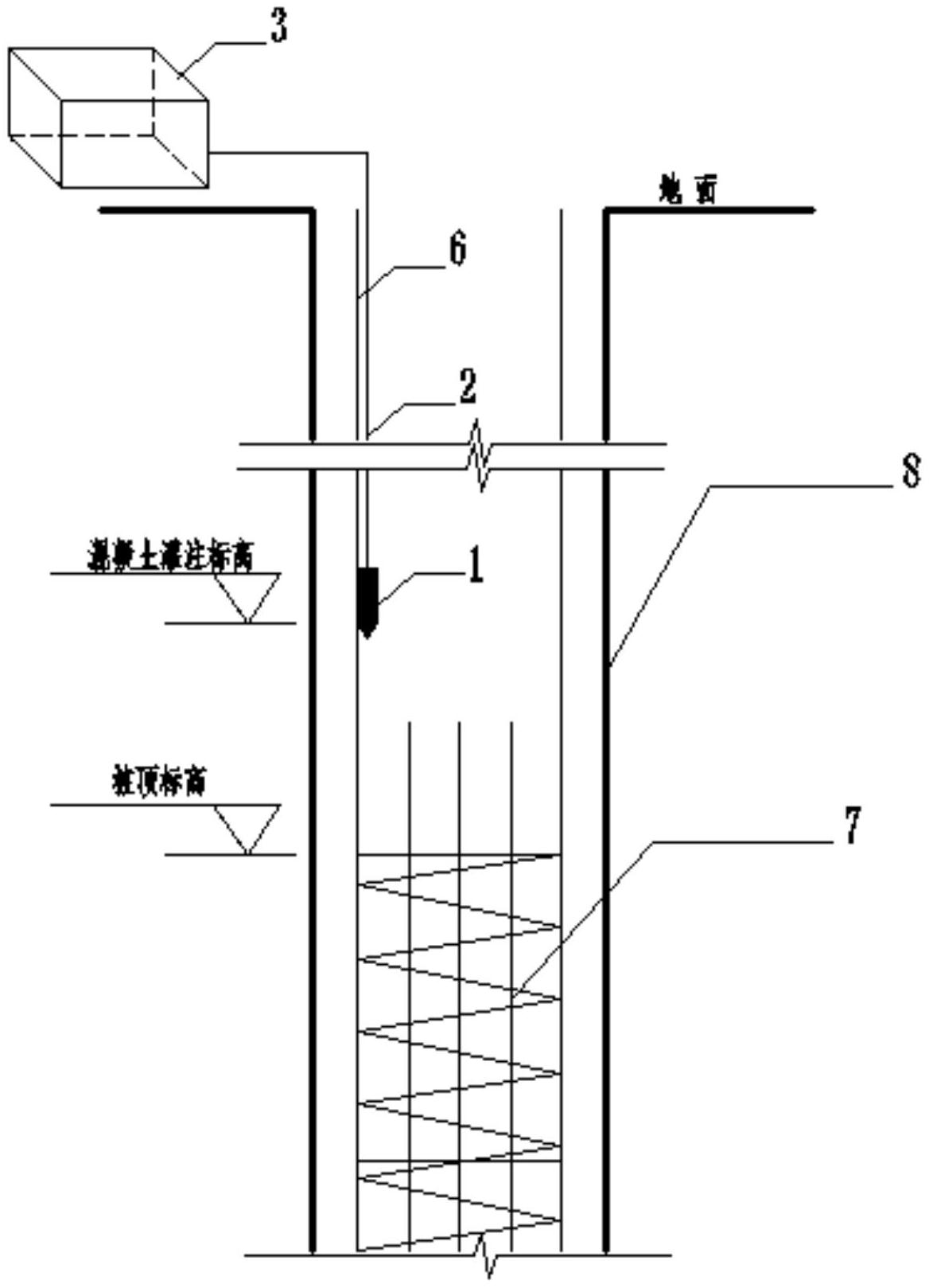 本实用新型提供一种水下灌注混凝土标高控制装置,涉及混凝土标高技术领域,包括计算机设备、吊筋和桩孔,所述桩孔的内部安装有钢筋笼,所述钢筋笼上焊接有吊筋,所述吊筋上焊接有托架,所述托架的顶部焊接有固定卡子,所述固定卡子的内部安装有PH传感器;通过将PH传感器安装于混凝土确定的超高位置,在混凝土灌注前,先测定混凝土的PH值,混凝土灌注施工中,当计算机设备显示的PH最大值、且与混凝土灌注前测定的PH数值相当时,即可判定混凝土达到超灌高度要求,混凝土灌注施工结束。