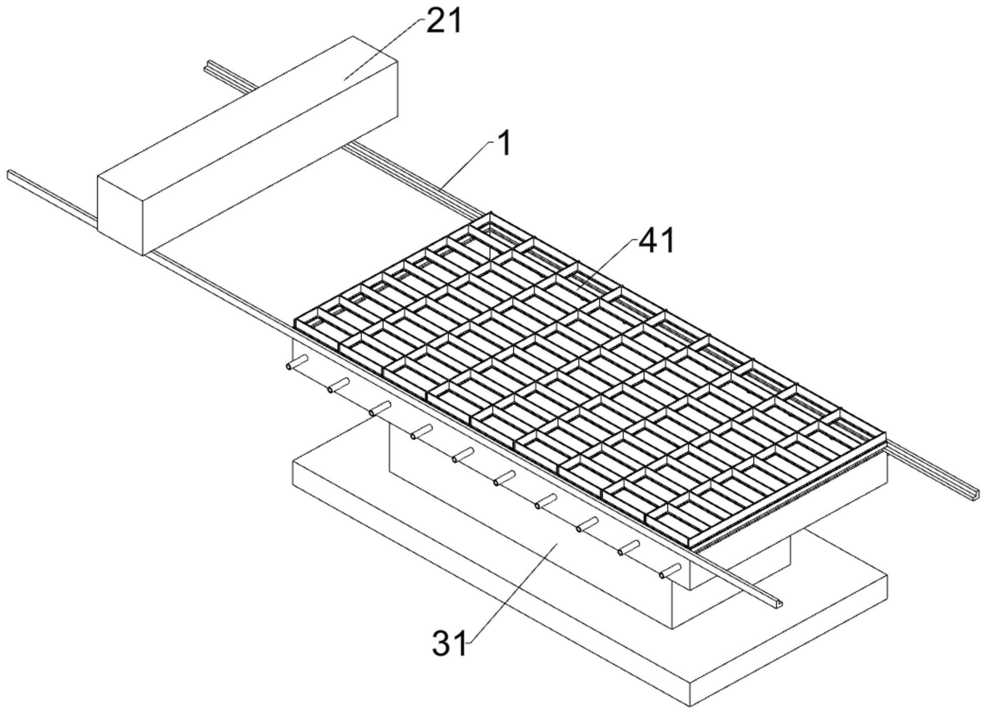 本发明涉及烧结砖加工技术领域,尤其涉及一种制备钢渣烧结砖的系统。一种制备钢渣烧结砖的系统,固定架可拆卸设置在滑轨上,滑轨在轨道上移动,轨道依次经过胶水涂覆装置和真空抽取装置,最后进入UV室内。使步骤4烧结成型的烧结砖的上表面涂敷一层UV无影胶,经过真空抽取装置,将位于烧结砖一面上的UV无影胶渗透入烧结砖的内部缝隙和空洞之间,再经过UV灯照射进行固化,得到的烧结砖的抗压平均值在34.9MPa‑35.2MPa之间,大于最大强度等级MU30的抗压强度平均值为30.0MPa,得到的烧结砖为优等烧结砖,性能优于市场上大多数烧结砖,可用于建筑生产等方面。