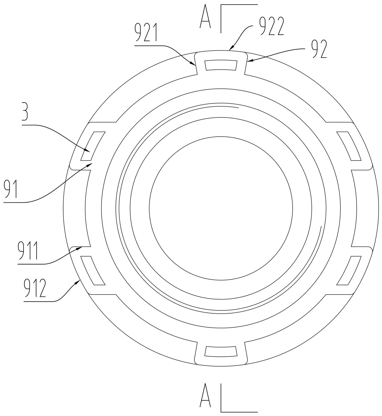 本申请公开了一种塑料嵌件,属于给排水管件领域,用于聚烯烃管件,其壳体为加工有通孔的柱体结构,壳体的底端设有带底部止水槽的环形底台,环形底台至壳体端口之间分布有若干周向环体,周向环体上分布有若干周向防转爪,相邻周向环体形成周向止水槽;周向环体在壳体的端口处形成端口错台,通孔朝向壳体端口的内部加工有内螺纹,通孔朝向壳体底端的位置处设置有环形凸起构成的封胶凸台,封胶凸台在靠近壳体底端的一侧形成底部封胶斜面;端口错台处的周向防转爪的端面加工有防转槽。鉴于上述技术方案,本申请能够通过对嵌件的材料及结构进行改进,保证塑料嵌件与聚烯烃材料件的密封性、塑料嵌件与聚烯烃材料之间的包覆力。