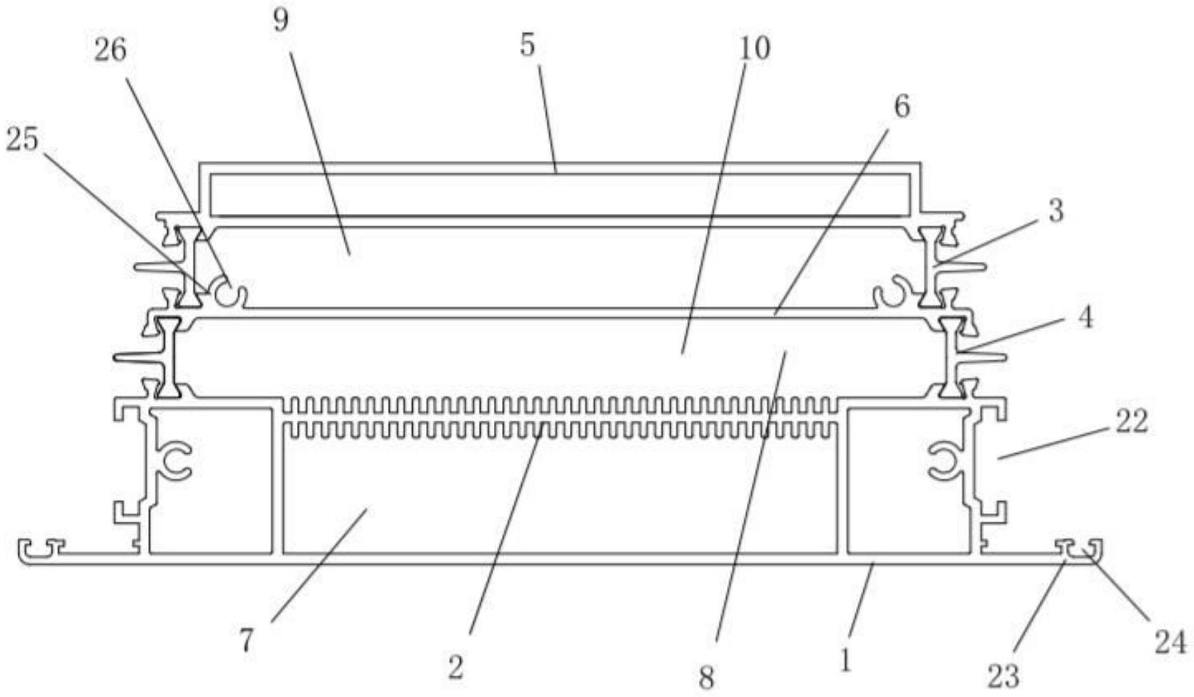 本实用新型公开了一种新型通风消声器型材结构,涉及到消声器技术领域,包括消声器骨架、换热降噪机构、第一隔热条、第二隔热条、第一骨架和第二骨架,消声器骨架上设有出风通道,出风通道的一侧设有换热降噪机构和第一骨架,第一骨架位于换热降噪机构远离出风通道的一侧,且第一骨架与换热降噪机构之间形成消声腔体,第二骨架设于消声腔体内,且第二骨架将消声腔体分隔成第一进风通道和第二进风通道,第一进风通道位于第一骨架与第二骨架之间,第二进风通道位于第二骨架与换热降噪机构之间,第一进风道的两侧通过两第一隔热条密封,第二进风道的两侧通过两第二隔热条密封。其生产成本低,能够起到换风、透气降噪音的作用。