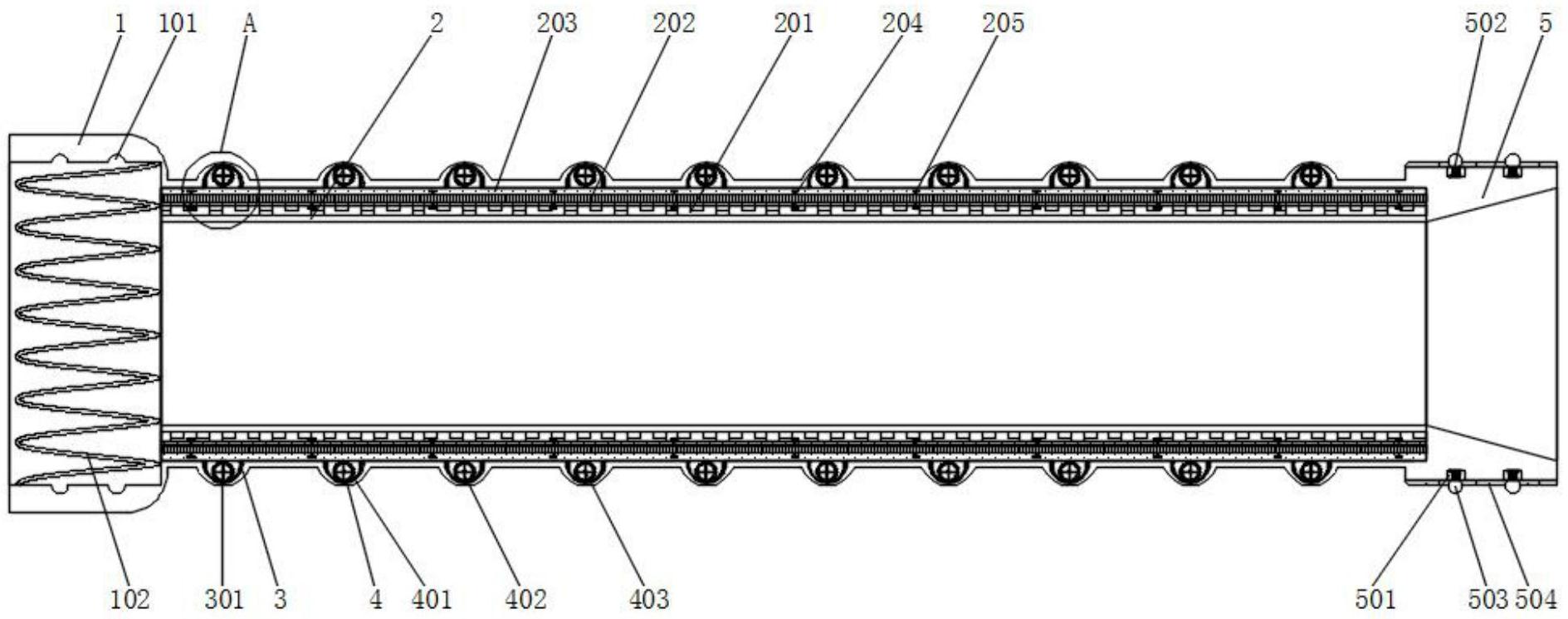 本实用新型公开了一种抗压能力强的加强型克拉管,包括承口、克拉管本体、外缠绕管、增强管和插口,所述克拉管本体的两侧分别固定连接有承口和插口,所述克拉管本体的外侧缠绕安装有外缠绕管,所述外缠绕管的内部设置有增强管,所述克拉管本体的内壁上设置有防腐层和第一加强筋,所述第一加强筋的内外侧皆包裹有聚氨酯保温层。本实用新型通过在插口的上下两侧设置有凹槽,凹槽的内部通过弹簧固定安装有球形卡扣,且承口内部设置有配合使用的卡槽,方便管道的对接安装,承口内部设置的电热丝使承口插口加热融合,是连接更加稳固密封,克拉管本体内的多层结构以及外侧设置的增强管,提高了克拉管的抗压强度。