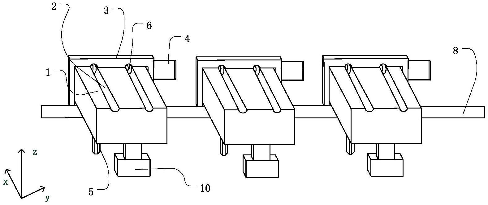 本实用新型公开了一种胶膜防滑点烫装置,包括三组沿第一方向延伸的横向轨道,横向轨道远离地面的一侧设有导轨,每个横向轨道的外侧套设有两个移动框,移动框靠近地面的一侧设有点烫头,移动框沿导轨在第一方向上移动;横向轨道的端部设有升降装置,升降装置控制横向轨道沿垂直于地面的方向移动。三组横向轨道可对应到进行点烫胶膜的上下两端以及中间位置,每组横向轨道套设两个移动框,移动框接近地面一端设有点烫头,可实现6个位置点烫,增加点烫位置,增强防滑效果;横向轨道远离地面一端设置导轨,移动框沿导轨移动,可带动点烫头移动,适应不同尺寸实际需求,提高胶膜防滑点烫装置的适用性。