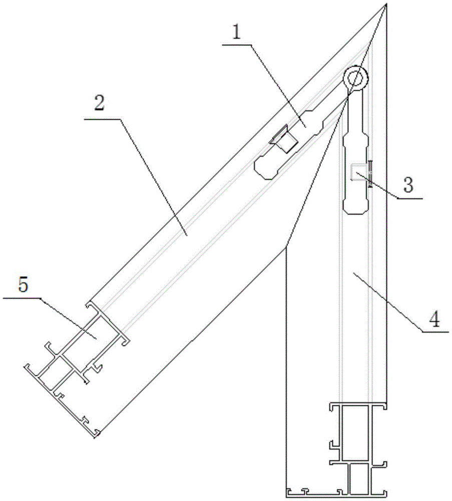 本实用新型涉及门窗技术领域,具体为属于一种门窗边框异形转角连接结构。铝合金窗框的拐角连接处内设角码,角码1套设在第一窗框腔和第二窗框腔内,第一窗框腔和第二窗框腔顶端对接,第一窗框腔和第二窗框腔底端分别与铝型材框架通过螺栓连接。通过M8异形螺栓连接,同时采用过盈配合,同时角码型材通过销钉连接,可以自由旋转,实现角度调整,两个角码型材端头加工成矩形豁口,留出旋转空间,保证连接的可靠性。连接边框型材的角码通过销钉作为转轴实现角度可调,角度可以调整,连接强度高,可以实现长途运输,便于工厂化生产加工。