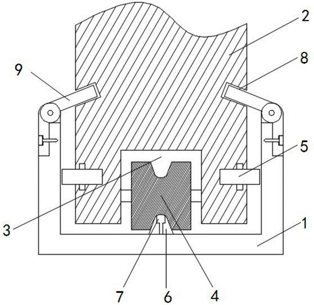 本实用新型提供了一种铝合金推拉门底托结构,属于铝合金技术领域,包括:底托本体和推拉门,推拉门嵌入底托本体内部活动连接,推拉门底部设有凹槽,凹槽内活动连接有导向轮,推拉门两侧活动安装有滚轮,导向轮底部嵌入安装导向块,导向块内部开口设有螺栓孔,滚轮上方开口设有滑槽,滑槽内嵌入设有挡块,挡块底端通过螺栓与底托本体固定连接,该种铝合金推拉门底托结构,其能够防止推拉门在使用时与推拉门底托脱离,并且增加推拉门的隔音和防水功能,该结构设计合理,实用性强。
