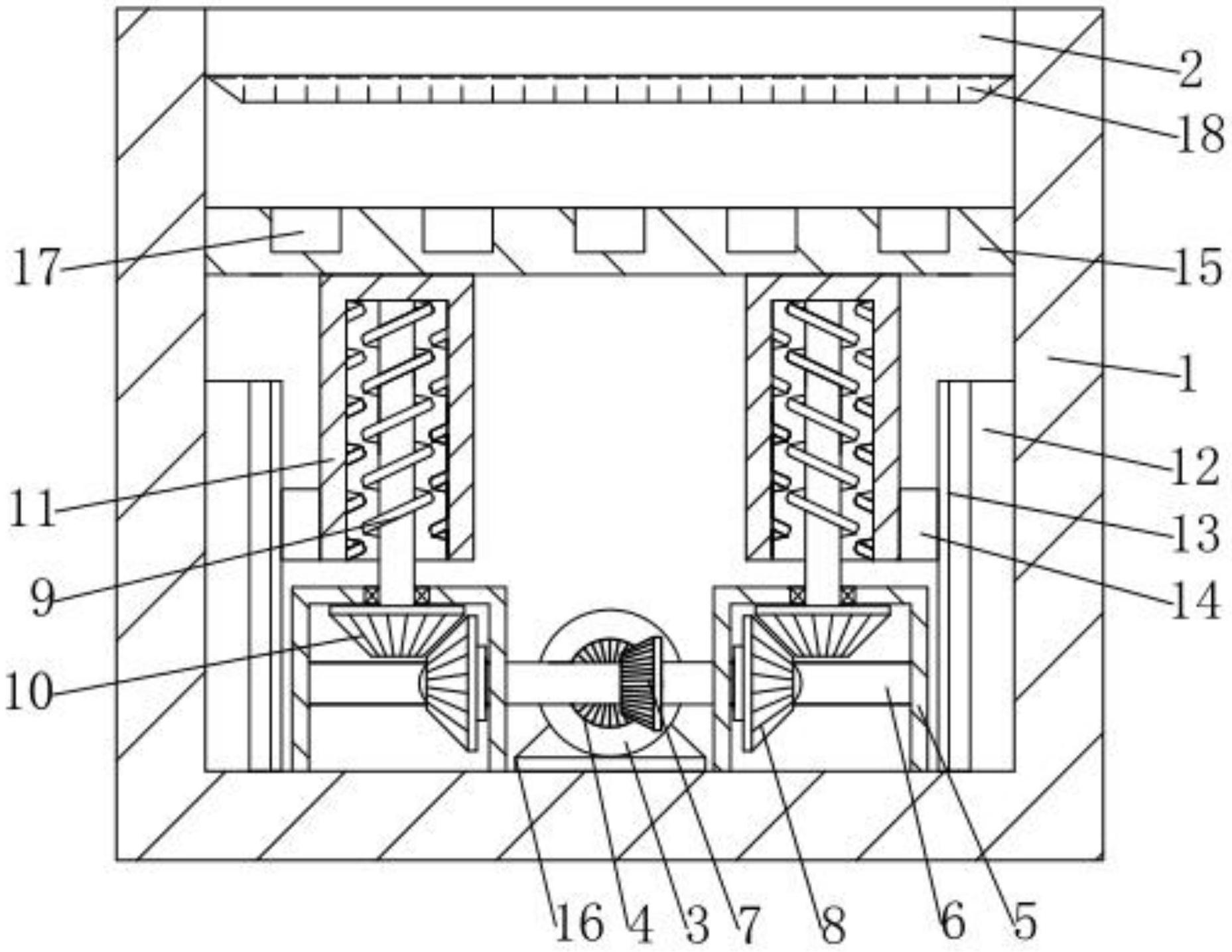 本实用新型公开了一种铝型材的固定装置,包括支撑台,所述支撑台上壁面开设有开口,所述支撑台上壁面开口处固定嵌装有压紧台,所述支撑台内下壁面安装有调节结构;本实用新型涉及铝型材技术领域,本装置结构合理,成本低,使用方便,通过调节结构内的电机带动转杆转动,可以使得支撑架上的螺纹套筒进行上升,螺纹套筒带动调节板上升后对铝型材进行夹紧,通过控制电机的转动量可以调节夹紧时的张力,并且调节板内开设有若干个凹槽以便于铝型材的固定,同时压紧台下方设有橡胶垫,橡胶垫可以保护铝型材,防止调节板与压紧台挤压过度对铝型材造成损坏。