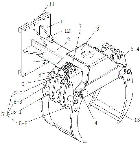 本实用新型公开了一种双向同步夹紧式抓木器,包括有竖直放置的底座,底座的前端面中部安装有横置的前移支撑臂,前移支撑臂的前端部安装有夹持座,夹持座的两侧分别通过翻转轴安装有可翻转的夹臂总成,夹臂总成的翻转动力通过其之间的夹紧油缸驱动,夹持座内侧通过从动转轴安装有两并列设置且相互啮合的同步齿轮,同步齿轮的转轴端部与其对应侧的夹臂总成的翻转轴端部之间通过连杆组件传动连接,连杆组件包括有两呈一定角度设置且固定连接的杆体一和杆体二。本实用新型可解决了精确对准的操作难度,使其大致对应木材的中间位置即可实现抓取操作,节省了操作空间的限制,而且两侧同步动作稳定性好。