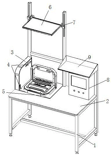 本实用新型公开了一种车位锁检测装置,包括有机架,所述机架上架设有检测台,所述检测台上的一端设置有检测开关面板,所述检测开关面板的底端和上端部分别设置有检测开关,所述检测开关面板内侧的工作台上设置有用于固定车位锁的固定板,所述固定板的正上方架设有可翻转的超声检测板,所述超声检测板通过检测台后侧的支架总成架设固定,所述超声检测板和检测开关分别通过电信号线连接至电器柜内的控制器。本实用新型结构设计合理,整个检测过程中,人工劳动强度小,省时省力,检测精准度高,满足了智能车位锁大批量高精度检测的需要。
