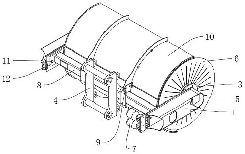 本实用新型涉及工业用车技术领域,且公开了一种轻量化高空清扫器,包括侧臂,所述一侧的侧臂的内壁固定连接有液压马达,所述液压马达的左端转动连接马达连接座内壁,所述马达连接座的内壁固定连接滚轴,所述滚轴的外圈固定连接有滚刷,所述一侧的侧臂上固定连接有蓄能器,且蓄能器可在切断油路后起到缓冲作用,所述侧臂数量设置为两个,且两个侧臂均与固定板接触,所述固定板的数量设置为两个,且固定板相互靠近的一端固定连接横梁的两端,所述固定板的前端内壁与固定销轴外圈接触,所述固定销轴贯穿固定板连接侧臂。该一种轻量化高空清扫器,通过拆卸固定销轴,取消侧臂和固定板的连接,使侧臂达到快速拆卸的目的,从而便于更换易损件。