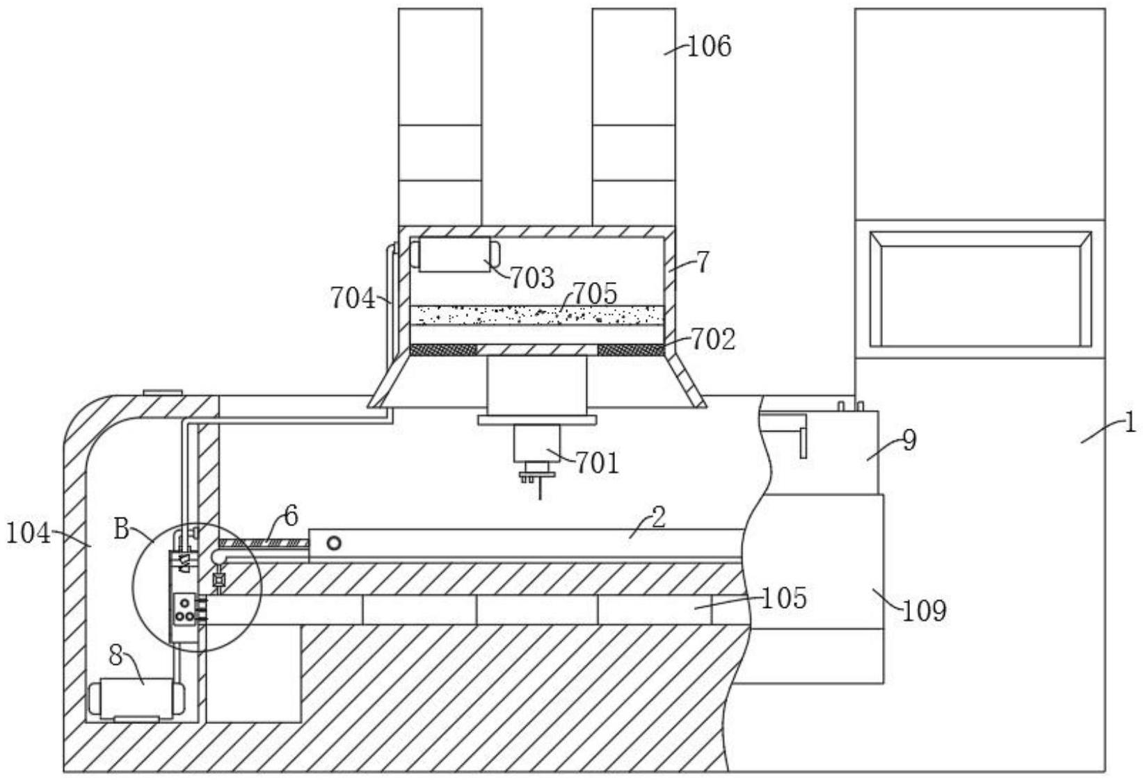 本实用新型公开了一种电火花切割机,属于机床技术领域。一种电火花切割机,包括基台及开设在基台顶部的加工腔,基台顶部设置有切割头,还包括:用于固定加工件的电磁板,加工腔底壁和电磁板的底壁均开设有半圆形槽体,两组半圆形槽体拼接形成圆柱形通孔,圆柱形通孔内转动连接有调节轴,调节轴上固定连接有涡轮片,两则调节轴的旋转方向相反;设置在储液腔内的循环供液部,用于调节加工腔内的液体水位;本实用新型通过加工腔内的工作液顺时针或逆时针运动,从而保证不在工作液内产生气泡的同时,有效地带走切割点产生的电蚀产物,一方面,持续运动的工作液可以防止其温度升高过快,另一方面,保证导电通道的有效电离,提升加工的稳定性。