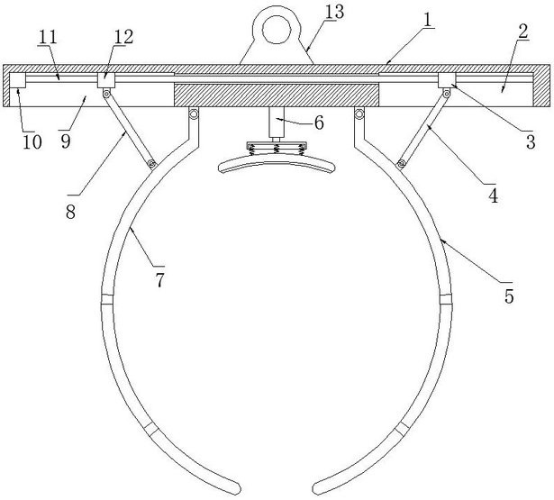 本实用新型公开了一种钢丝骨架给水管加工用吊具,包括安装座,所述安装座的底部安装有电机,所述电机的输出轴连接有丝杆,所述丝杆上通过旋向相反的螺纹套接有第一滑块和第二滑块,所述第一滑块和第二滑块滑动安装在安装座的底部,所述第一滑块通过第一连杆铰接连接有第一夹板,所述第一夹板铰接在安装座的底部,所述第二滑块通过第二连杆铰接连接有第二夹板,所述第二夹板铰接在安装座的底部,所述安装座的底部安装有液压缸,所述液压缸的活塞杆固定有升降座,所述升降座通过弹簧连接有第三夹板。本实用新型起吊方便,夹持稳定,不易脱落,安全性好。