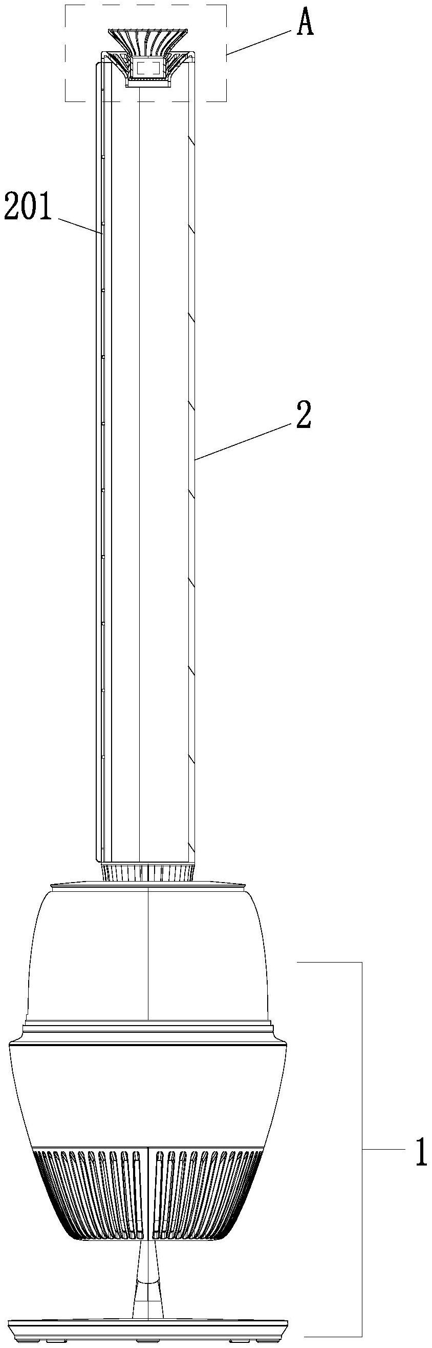 本实用新型公开了一种无叶风扇,包括底座和出风立柱,底座内安装有风机组件,出风立柱安装在底座上,并与风机组件连通,出风立柱的侧壁开设有第一出风口,所述出风立柱的顶部开设有第二出风口,出风立柱的顶部活动安装有关闭或打开所述第二出风口的顶塞;通过增加顶部出风的结构,实现更好的气流循环的目的,扩大吹风面积,使无叶风扇的使用效果得到有效的提升。