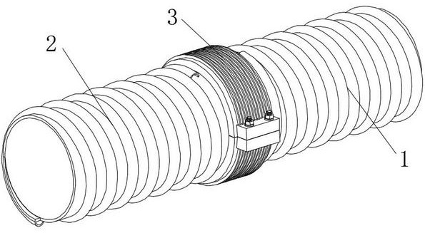 本实用新型公开了一种用于钢带螺旋波纹管的端部加强组件,包括一级波纹管体、二级波纹管体和用以其两管体端部的加强连接件,一级波纹管体的管壁上设置有钢带体,二级波纹管体和一级波纹管体的结构相同,加强连接件包括上位连接件和下位连接件所构成,下位连接件和上位连接件的结构相同,且其两者为对称设置,且其两端分别设置有上位安装座和下位安装座,上位安装座和下位安装座均对称设置有两个;通过将波纹管体上的钢带体的两端设置成相平行的两个四分之三圆弧,并在其两端设置加强钢带,并在加强钢带的设置加强管,从而通过其来对波纹管的两端进行加强,从而提高其管体的整体强度,避免其在运输过程中导致其端部受力变形而导致其安装困难。