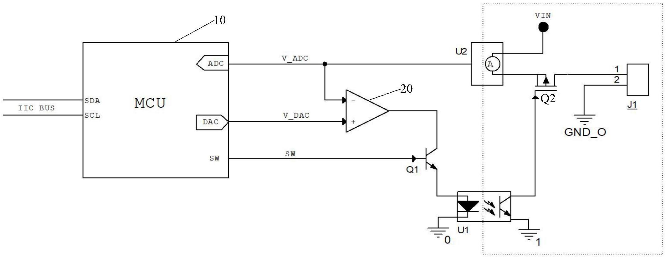 本实用新型提供了一种智能过流保护电路,包括MCU、比较器、电流检测芯片、开关电路、负载,所述MCU分别与所述比较器、所述电流检测芯片、所述开关电路相连,所述比较器分别与所述电流检测芯片、所述开关电路相连,所述电流检测芯片与所述开关电路相连,所述负载与所述开关电路相连。本实用新型的有益效果是:本实用新型采用比较器控制mos管进行过流保护,当负载电流过大时,比较器直接输出低电平关断mos管进行过流保护,过流保护期间不需要MCU参与,速度非常快。