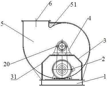 本实用新型公开了一种可使电机噪音降低的离心式风机,包括底座,还包括设置于底座上的电机、支撑座和风机,所述的支撑座罩住所述电机,所述的支撑座上设置有轴承座,所述的轴承座上穿设有旋转轴,所述的旋转轴与电机联动并与风机内部的风机叶轮连接。通过上述方式,本实用新型所述的一种可使电机噪音降低的离心式风机,其降噪效果显著、运行稳定,还节省了空间。