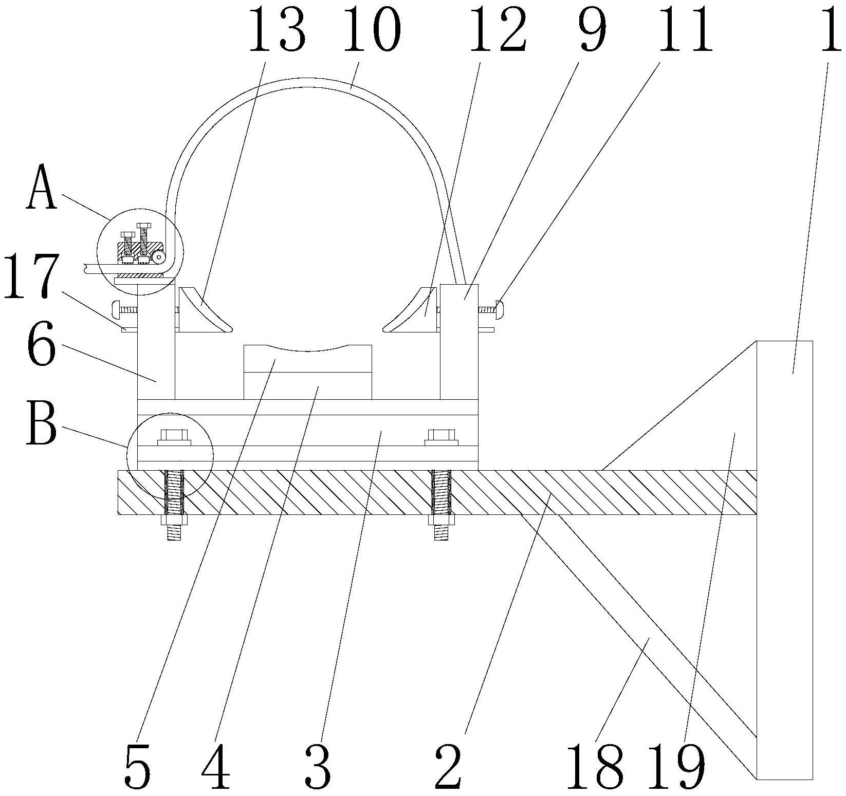 本实用新型涉及管道技术领域,尤其为一种管廊多向抗震支架,包括安装板,所述安装板的左侧栓接有托举杆,所述托举杆的顶部栓接有工型底座,所述工型底座顶部的中端栓接有托举块,所述托举块的顶部粘合有弹性块,所述工型底座顶部的左侧栓接有第一支杆;本实用新型通过安装板、托举杆、工型底座、托举块、弹性块、第一支杆、辅助板、卡接机构、第二支杆、固定带、螺杆、斜块和弹性垫的设置,使得该管廊多向抗震支架,具备既能固定各种直径的管道,也能拥有良好减震效果的优点,解决了目前的支架所要用到的钢箍多样,每次使用都需要携带各种型号的钢箍对管道进行固定,而且这类的支架减震效果差的问题。
