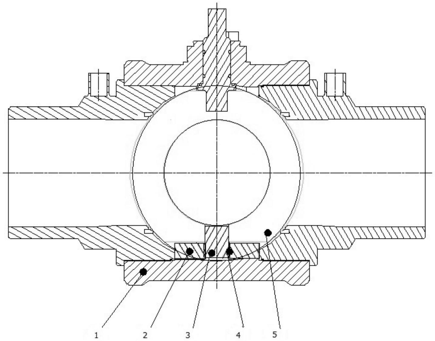 本实用新型涉及PE球阀的技术领域,特别是涉及一种球固定式PE球阀,其通过在球体底端紧固插装定位销,并且通过定位销与定位块转动配合,使球体除转动之外,再无其它动作,定位块安装在阀体中间,定位块与阀体接触面积大,可有效承受球体传递的推力,球体的固定减少球体的移动和球体对橡胶阀座密封比压,有效解决了球阀内漏和扭矩增大的问题,提高使用稳定性;包括阀体、定位块、定位销、金属镶件和球体,所述阀体内部设置有通水腔,所述定位块固定安装在阀体内部底端,所述定位块中部连通设置有插孔,所述插孔侧壁上安装有金属镶件,所述定位销转动插装在定位块插孔中,所述球体中部连通设置有过水孔,所述球体底端设置为平面。