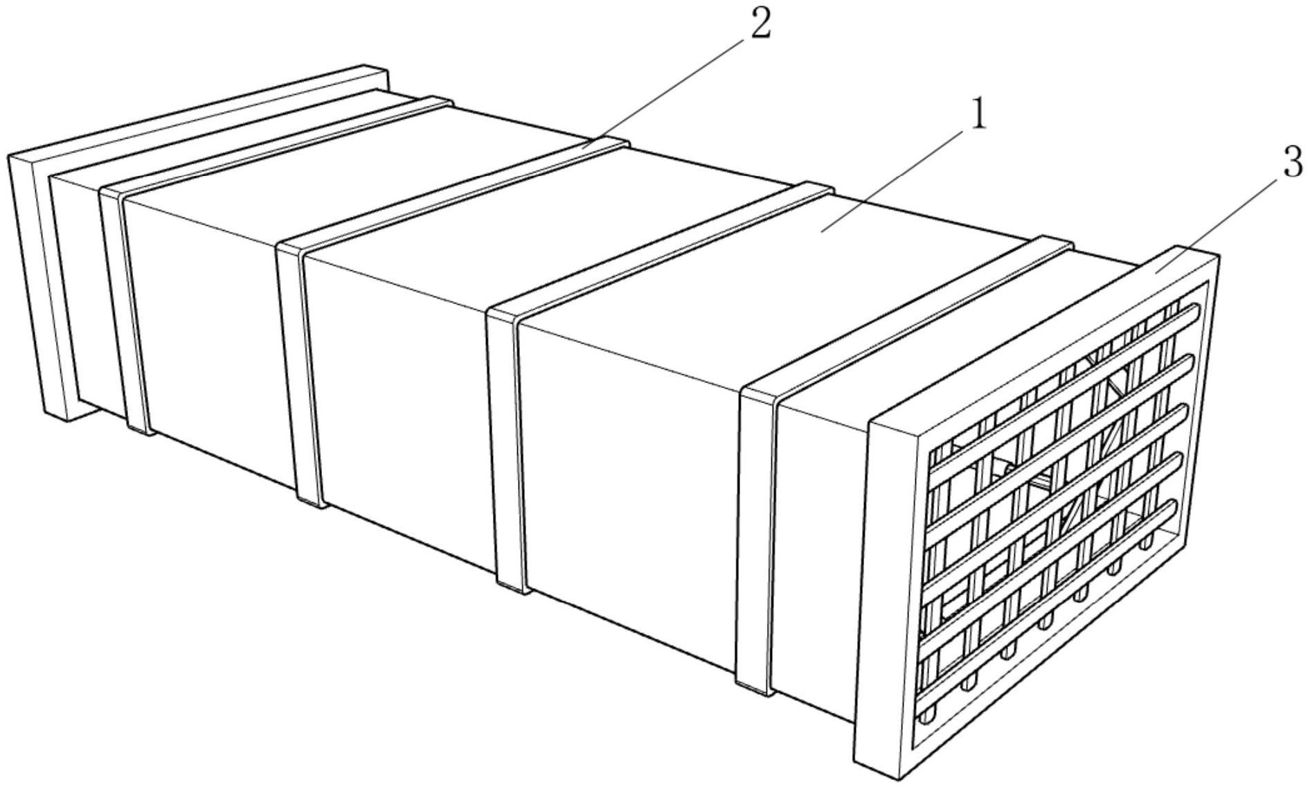 本实用新型公开了一种具有加强结构的玻镁风管,包括玻镁风管本体,玻镁风管本体的外表面等距并排固定套接有多个防护框,玻镁风管本体的两端均卡接有阻隔组件。上述方案中,玻镁风管通过设置加强结构本体,在玻镁风管本体使用之前,首先分别将第一加强板和第二加强板对安装孔进行卡接,然后再将限位杆对准限位筒的内壁进行卡接,使得将加强结构本体进行组装,然后再将组装后的加强结构本体放置在玻镁风管本体内部,使得加强结构本体的外表面与玻镁风管本体的内壁相贴合,因为第一加强框、第一加强板、第二加强框和第二加强板的材质均为钢质构件,所以即使受到压力,也不会发生变形,从而保证玻镁风管本体的质量,减少损失。
