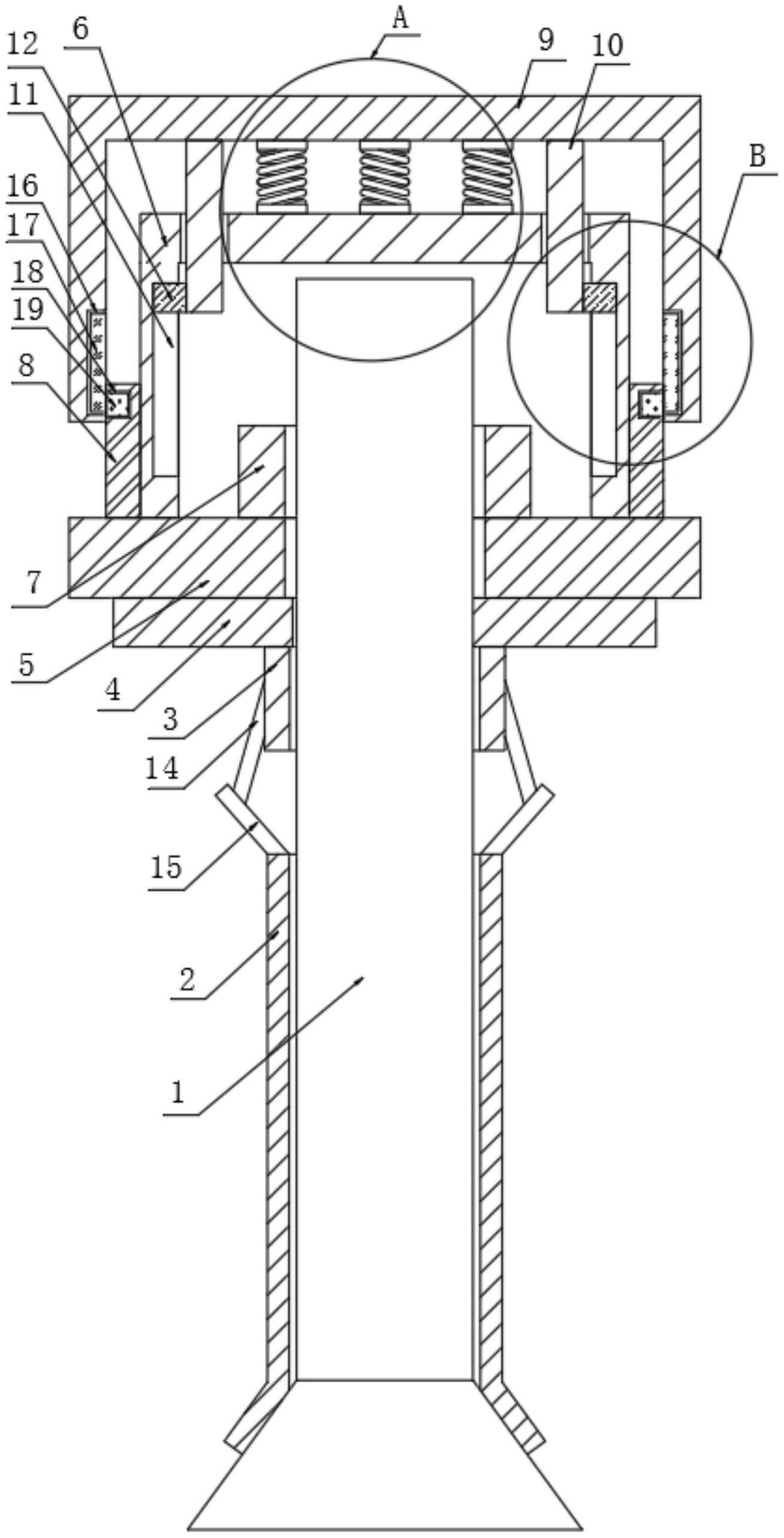 本实用新型公开了一种高效抗震膨胀锚栓,具体涉及锚栓的技术领域,包括螺栓和膨胀管,所述膨胀管套设于螺栓底端外部,所述膨胀管顶部设有支撑管,所述支撑管套设于螺栓外壁,所述支撑管和膨胀管之间固定设有定位装置,所述定位装置设置于螺栓两侧,所述支撑管顶部固定设有连接板,所述连接板顶部固定设有固定板,所述固定板和连接板均套设于螺栓顶端外壁,所述固定板顶部设有防护板。本实用新型通过防护板与螺纹管的连接,对螺栓和紧固螺母整体进行了防护,并在受到撞击时安装板首先与外界的撞击接触,然后对弹簧进行挤压,使弹簧将受到的冲击力进行分散和减缓,避免强大的冲击力对螺栓和紧固螺母造成损坏。