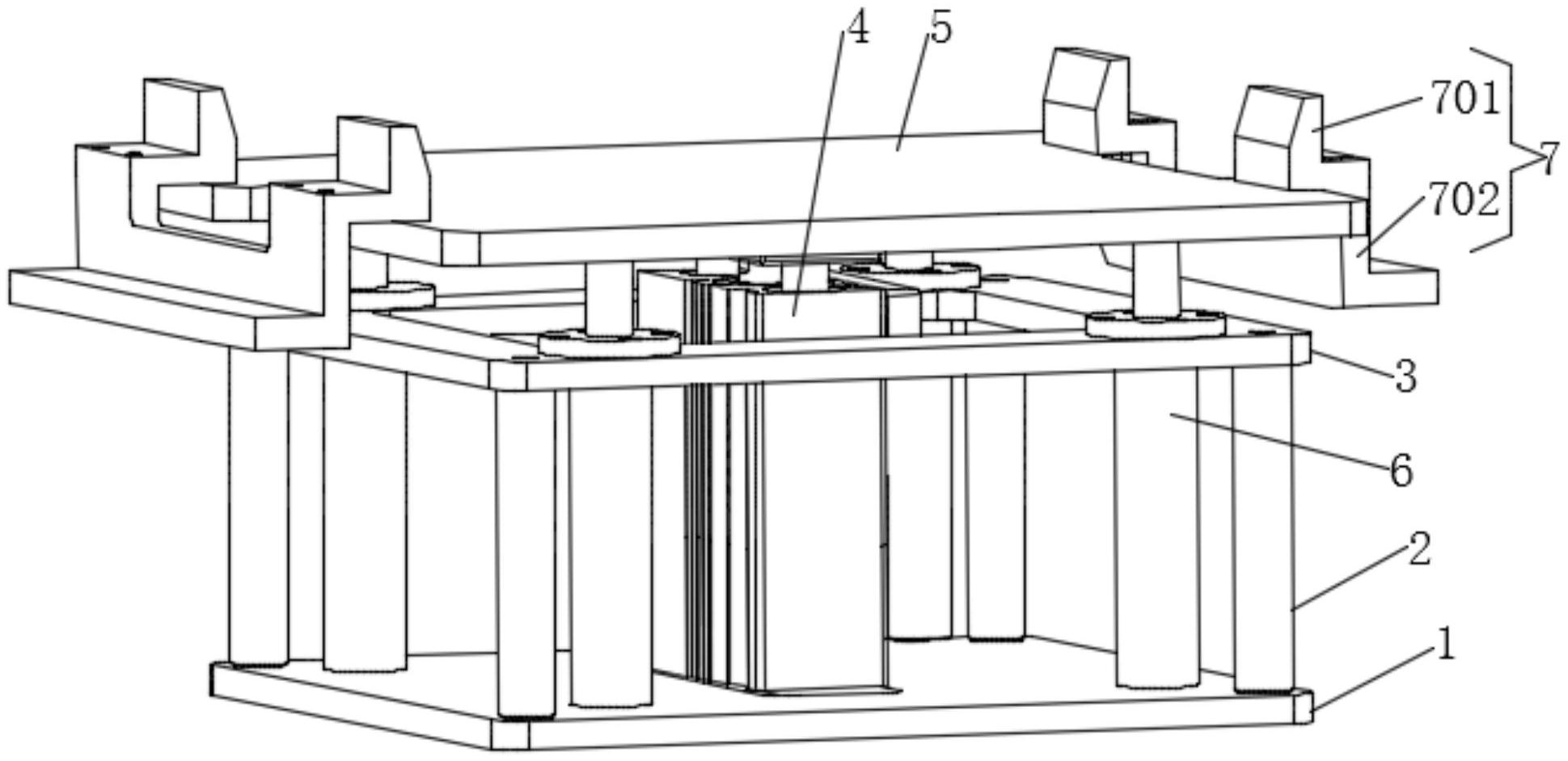 本实用新型公开了可调式轨道支撑架,设置底部座板,底部座板的四角处固定连接支撑柱的一端,支撑柱的另一端与中部固定框固定连接,中部固定框的上侧设置有轨道支撑板,底部座板的中部位置安装有主驱动液压缸,主驱动液压缸的输出端穿过中部固定框与轨道支撑板固定连接,主驱动液压缸用于调整轨道支撑板的高度,通过主驱动液压缸工作,带动轨道支撑板承载其所架设的轨道在竖直方向上位置,轨道高度得到调节,底部座板和中部固定框之间设置有伸缩导向管组件,伸缩导向管组件与主驱动液压缸同步升降,保持轨道支撑板在升降过程中的平衡性,轨道支撑板上对称设置有轨道连接板,轨道连接板与轨道相连接,使轨道固定在轨道支撑板上。