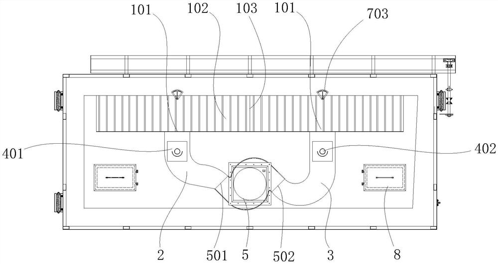 本实用新型公开了一种热风循环装置,包括热风腔,热风腔设于棒炉内的出棒侧上方,热风腔两端设有用于连接第一风道和第二风道的进风口,热风腔下端均匀设有若干条状吹风槽;燃烧机包括第一燃烧机和第二燃烧机;调风板包括设于棒炉顶部的调节部和设于热风腔内的导风部,导风部设于第一风道与第二风道与热风腔的连接口处;循环风机设于棒炉进棒侧的吸风口处,循环风机为双出风口的循环风机,循环风机两侧出风口分别与第一风道和第二风道连接。与现有的技术相比,本实用新型具有如下优点:双出口循环风机的特性将引风风道分为两路,使风槽两端的流量和压力差距减少,铝棒的温差也相减少。从而获得较高的铝棒加热速率,使铝棒的加热温度一致且均匀。