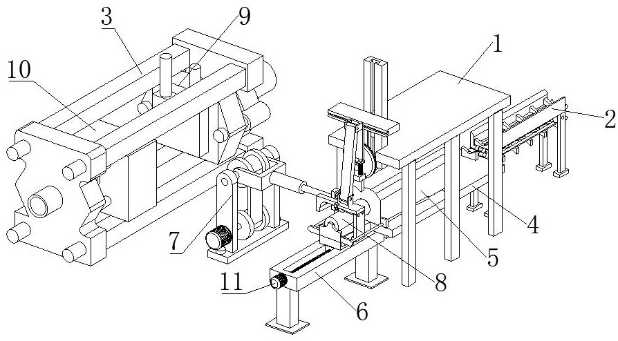 本发明涉及铝型材挤压技术领域,尤其为一种铝型材挤压生产线,包括工作台、挤压系统和上料装置,上料装置设置在工作台和挤压系统之间,工作台的一侧设置有输送系统,工作台远离输送系统的一侧设置有切割装置,工作台内下部设置有连接板,连接板顶端一侧安装有加热设备,加热设备内活动穿插连接有铝柱本体,挤压系统内一侧设置有模具,挤压系统内远离模具的一侧设置有推动装置。本发明的一种铝型材挤压生产线,利用切割装置可对挤压生产线上加热后的铝柱本体进行快速切割,提高了挤压生产线上的铝柱本体切割效率,同时铝柱本体切割稳定性好,提高了铝柱本体切割质量,并利用上料装置对切割后的铝柱本体进行快速上料,使得铝型材挤压效率高。