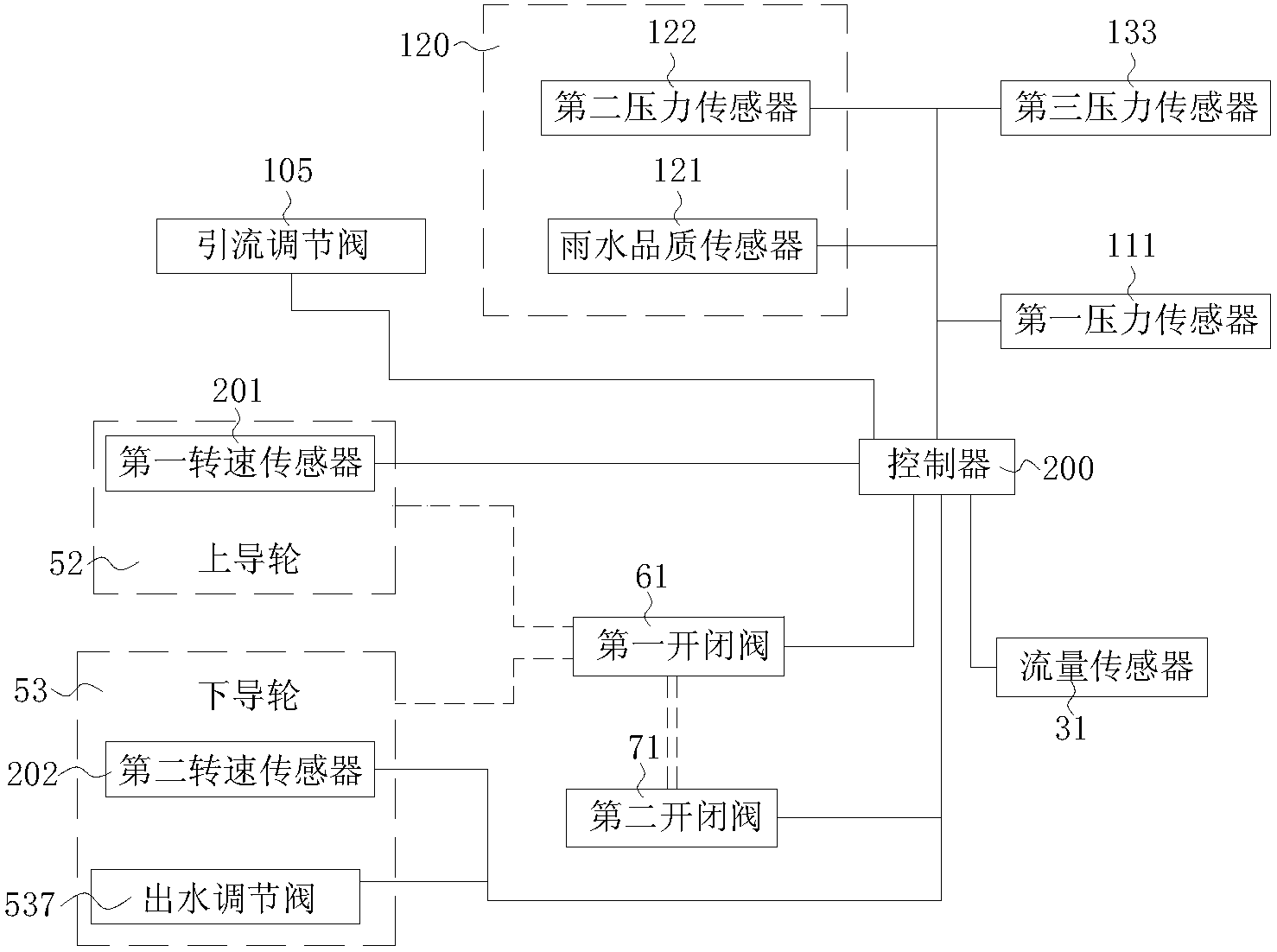本发明具体涉及雨水收集储存利用一体化系统的控制系统,目的是提供一种可针对不同降雨量、不同降雨时长情况下精确控制雨水弃流,对储存的雨水过滤净化进行精确控制的雨水收集储存利用一体化系统的控制系统。所述的控制系统包括过滤管内设置第一开闭阀,所述弃流管内设置第二开闭阀,所述下腔内设置雨水品质传感器,所述引流管的出口处设置引流调节阀;所述控制系统还包括控制器。通过控制上导轮、下导轮在不同情况下旋转,实现不同雨量、不同时长的初期雨水弃流,对储存的雨水可以有效的过滤雨水中的细微沙粒、微生物、油脂、重金属等杂质,同时对雨水过滤净化时间进行控制,提高雨水净化效率。