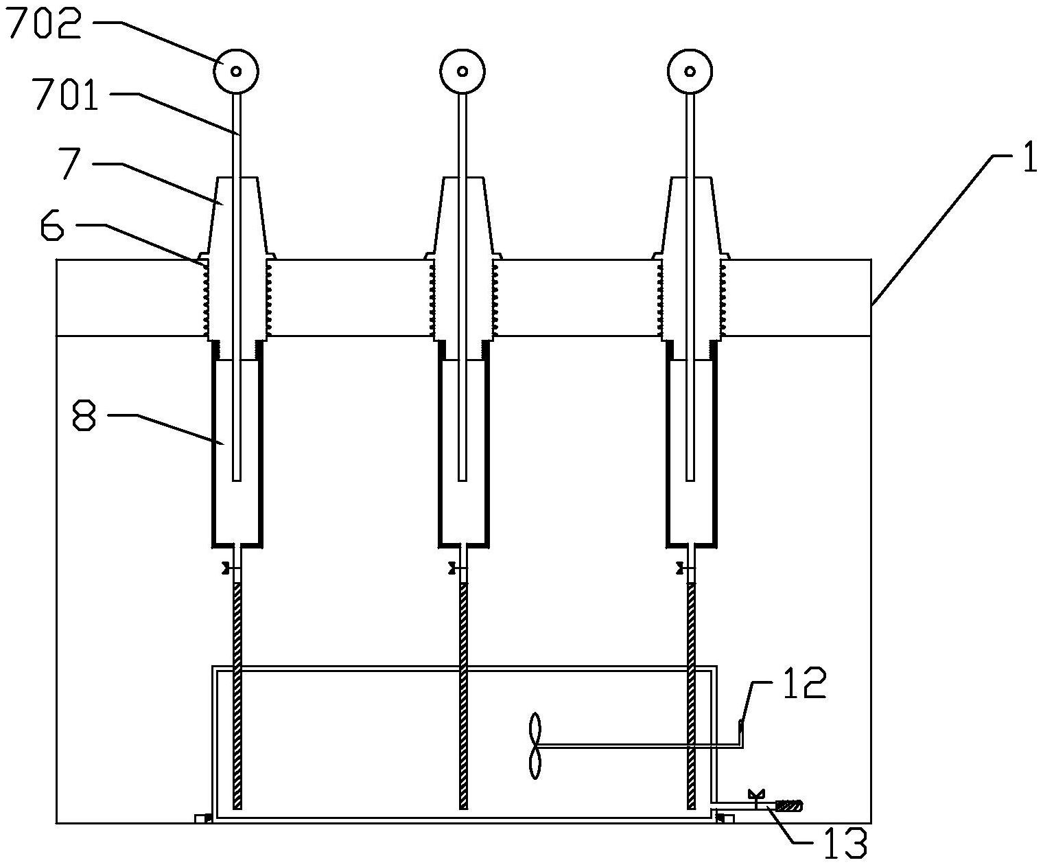 本实用新型公开了一种多功能空气治理采样装置,其特征在于:包括箱体、箱门、采样瓶,所述箱体顶部设置有若干个放置所述采样瓶的固定孔,所述采样瓶包括盖体和瓶体,所述盖体内竖直设置有入气管,所述入气管贯穿所述盖体;所述盖体外侧面设置有第一螺纹,所述第一螺纹下方设置有第二螺纹;所述固定孔内壁设置有与所述第一螺纹相适配的第三螺纹,所述瓶体顶部内侧设置有与所述第二螺纹相适配的第四螺纹;所述瓶体底部设置有第一出液管,所述第一出液管上设置有第一阀门,用于开关所述第一出液管,所述箱体底部设置有接液盆。本实用新型的目的在于提供一种多功能空气治理采样装置,采用多管入气,解决了空气样本单一的问题,提高空气治理效果。