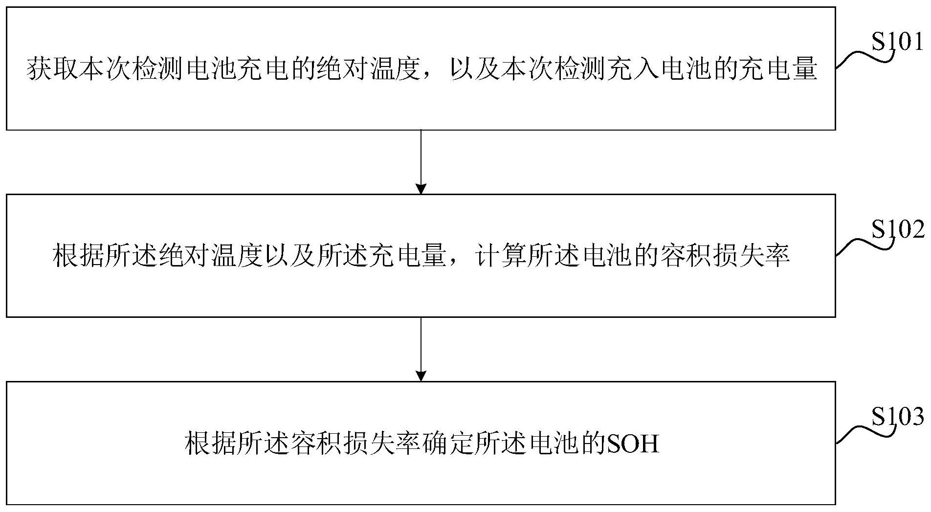 本发明提供一种电池健康状态SOH的检测方法及装置,用以解决现有技术对电池健康状态的检测不够准确简便的技术问题。该方法包括:在所述电池的充电过程中实时检测所述电池的SOH,其中,每一次检测执行以下操作:获取本次检测电池充电的绝对温度,以及本次检测充入电池的充电量;根据所述绝对温度以及所述充电量,计算所述电池的容积损失率;根据所述容积损失率确定所述电池的SOH。