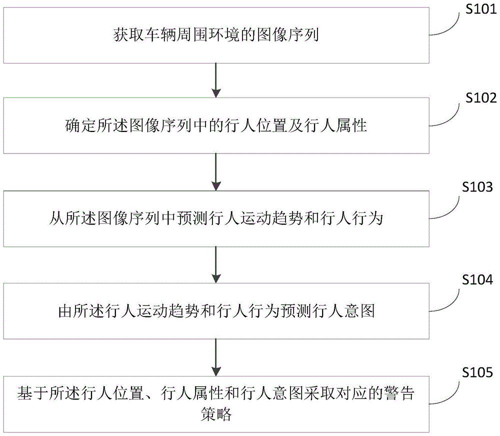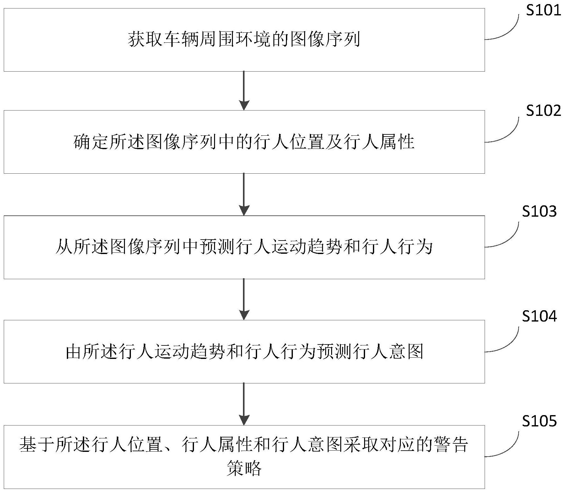本发明公开一种辅助驾驶方法、装置、车载终端及车辆,所述方法包括:获取车辆周围环境的图像序列;确定所述图像序列中的行人位置及行人属性;所述行人属性用于表征行人类别;从所述图像序列中预测行人运动趋势和行人行为;由所述行人运动趋势和所述行人行为预测行人意图;基于所述行人位置、行人属性和行人意图采取对应的警告策略。该方法可以自动获取车辆周围环境的图像序列,根据图像序列获取行人位置、行人属性、行人运动趋势及行人行为,并根据行人运动趋势和行人行为预测行人意图,最后根据行人位置、行人属性和行人意图自动采取对应的警告策略,为驾驶员安全驾驶提供有利辅助,提高车辆行驶的安全性,减少交通事故的发生。