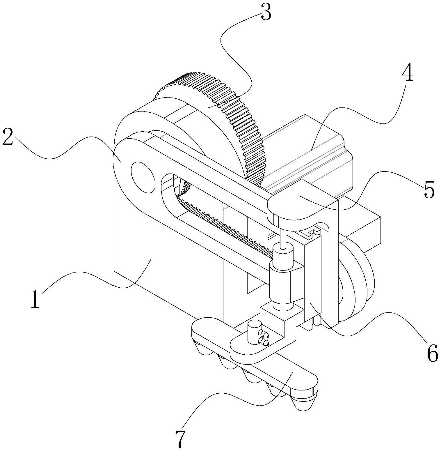 本实用新型公开了一种乳制品加工灌装用瓶体横向输送装置,涉及乳制品加工技术领域,包括支撑架,所述支撑架的上表面固定安装有伺服电机。该乳制品加工灌装用瓶体横向输送装置,通过电动推杆伸缩端的伸出推动滑架和连接板向下方进行移动,从而带动吸盘架向下方移动,并通过吸盘架对输送至下方的瓶体进行过吸附,并通过电动推杆伸缩端的缩入将瓶体拉起,通过伺服电机顺时针旋转一百八十度,带动齿轮二进行旋转,齿轮二带动齿轮一进行旋转,从而通过连接柱带动摆臂旋转一百八十度,并且摆臂旋转时,由于齿环为固定的,因此通过齿环外部的齿牙带带动齿轮三进行被动旋转,从而保持瓶体输送中的竖直状态,提高了该装置的跨区域输送效果。