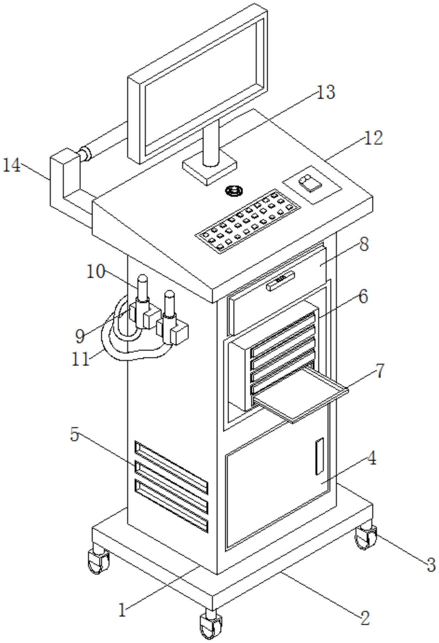 本实用新型涉及盆底肌肉康复技术领域,具体涉及一种产后盆底康复装置,包括机体、底板和万向轮,机体下端固定连接有底板,底板下端均活动连接有万向轮,机体一端镶嵌连接有机箱,机体一侧镶嵌连接有散热孔,机箱上端镶嵌连连接有打印机,打印机下端活动连接有出纸板。本实用新型克服了现有技术的不足,通过设置有启动按钮、膨胀体与探测头,使装置在进行使用时通过机体传导电流通过传导线传输给修复棒,人员在通过修复棒表面的启动按钮进行启动,启动后将修复棒伸入到女性阴道内部,随后通过膨胀体的膨胀与收缩作用来带动女性阴道肌肉进行活动,使得女性阴道肌肉通过膨胀体的膨胀收缩来进行紧缩性修复,防止后期影响夫妻生活。