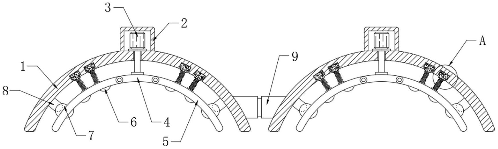 本实用新型公开了一种乳腺按摩治疗仪,包括两个第一壳体,所述第一壳体的顶部焊接有第二壳体,所述第二壳体的内部安装有电机,所述电机的输出轴贯穿第一壳体的顶部且焊接有转盘,所述转盘的外侧通过销轴均匀的转动连接有弧形板,所述弧形板的一侧均匀的一体成型有凸点,所述第一壳体的内侧壁均匀的焊接有挤压杆,可以通过电机输出轴的转动带动弧形板进行转动,从而通过挤压杆和受压球体使弧形板沿着销轴进行摆动,从而完成对人体的按摩工作,避免了传统装置只在表面进行摩擦的情况出现,使得对人体的按摩工作可以更加方便快捷的进行,同时使按摩的效果更加明显高效。