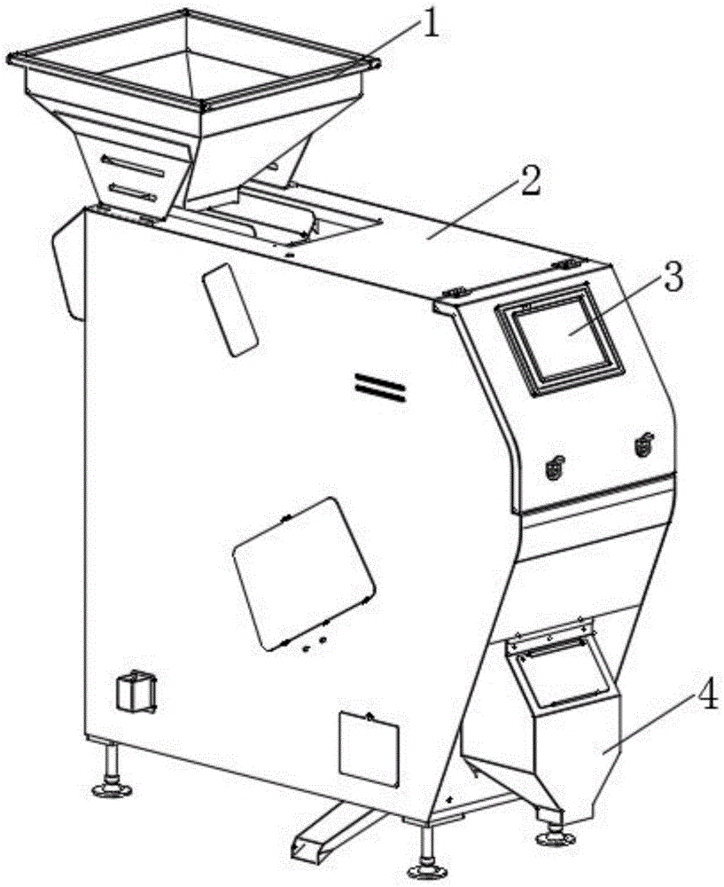 本实用新型公开了一种小型家用式色选机,包括上料斗、主机箱和下料斗,所述上料斗安装在主机箱的顶部一端,所述主机箱内部底端安装有电磁喷阀,所述主机箱的内部中端安装有分选箱,所述分选箱的内部两端均安装有LED灯组,所述主机箱的顶部一侧和底部一侧均安装有相机,两个所述相机均朝向分选箱,所述分选箱朝向所述相机的两侧呈中空设置,所述主机箱内部上端安装有相机电路板,所述主机箱的内部底端安装有喷阀驱动电路板,所述相机电路板电性连接操作屏、相机和喷阀驱动电路板。摒弃相应的辅助设备,降低生产中的操作步骤,降低机械的使用,进而降低了生产的成本,降低色选的总体费用,有利于工厂的生产。