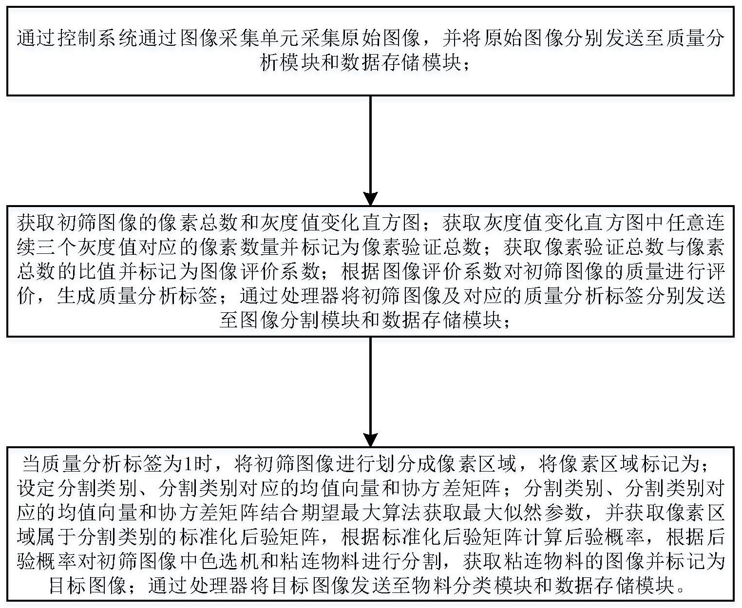 本发明公开了一种基于混合高斯模型的色选机粘连物料图像分割方法,涉及图像处理技术领域;本发明设置了质量分析模块,该设置用于对原始图像进行质量分析,并获取质量分析标签;质量分析模块通过灰度值的分布来判断初筛图像的质量,为图像分割模块提供数据基础;本发明设置了图像分割模块,该设置通过混合高斯模型对初筛图像进行分割;图像分割模块结合混合高斯模型完成对初筛图像的分割,能够保证对初筛分割图像的分割精度;本发明设置了物料分类模块,该设置对目标图像进行分析获取物料种类;物料分类模块通过分类模型完成对目标图像的识别,能够快速判断物料类别,有助于工作人员对设备和程序进行改进。
