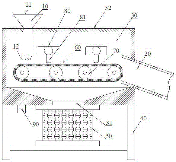 本实用新型涉及一种色选机除尘运输装置,包括进料斗和输送管道,还包括除尘箱体、支架、集尘箱、传送带、传送辊、液压油缸和振动器,除尘箱体架设在支架上,除尘箱体为密封结构,底部内壁为漏斗状,且中心设有出尘口,集尘箱可拆卸安装在支架上,集尘箱与出尘口连接,传送带通过传送辊安装在除尘箱体的内腔中,传送带为网状传送带,进料斗固定在除尘箱体的上端,传送带的末端连接输送管道,输送管道延伸至除尘箱体的外部,除尘箱体的内壁上设有多个液压油缸,且液压油缸均处于传送带的上方,液压油缸上设有伸缩杆,伸缩杆的一端连接液压油缸,另一端延伸时接触传送带的上端端面,振动器固定在除尘箱体底部的外壁上。